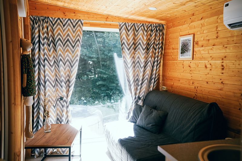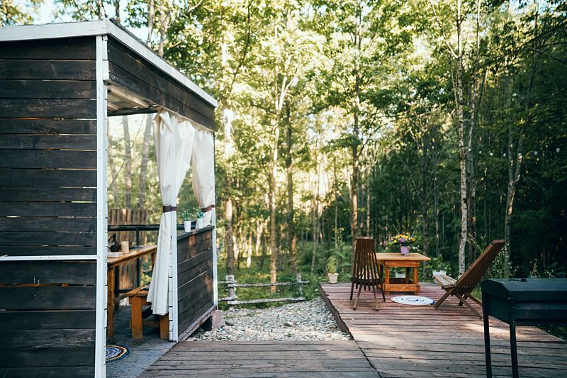 К услугам гостей - уютный и уединенный домик с панорамным окном на лес. Территория огорожена со своей мангальной зоной, беседкой. У домика есть своя небольшая терраса, на которой удобно отдыхать, заниматься йогой или читать книги.
