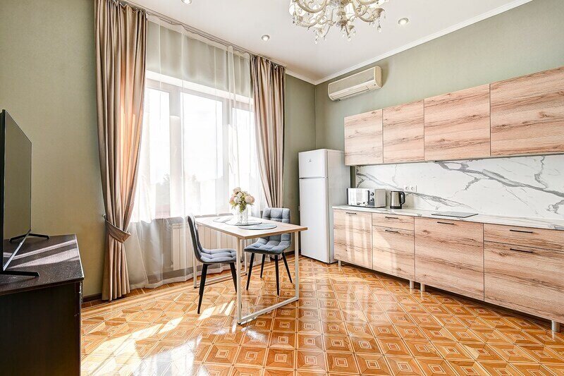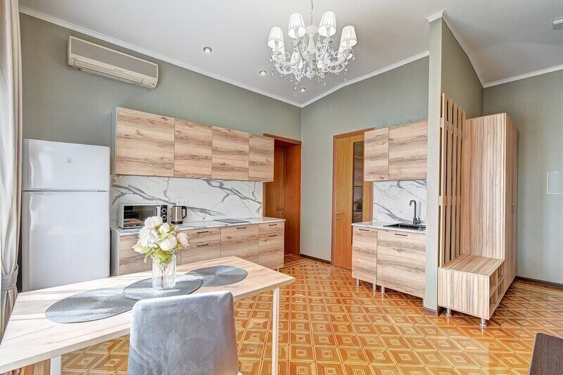 Каждый из номеров оборудован современной мебелью и техникой: удобные кровати, кондиционер, современный телевизор, холодильник, плита для приготовления пищи, микроволновая печь, электрочайник, набор посуды, интернет Wi-Fi, кухня, стиральная машина, фен, санузел с душем или ванной – всё, что нужно для комфорта.