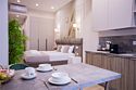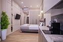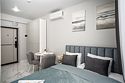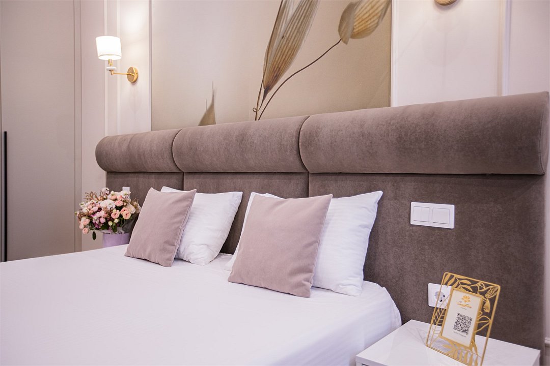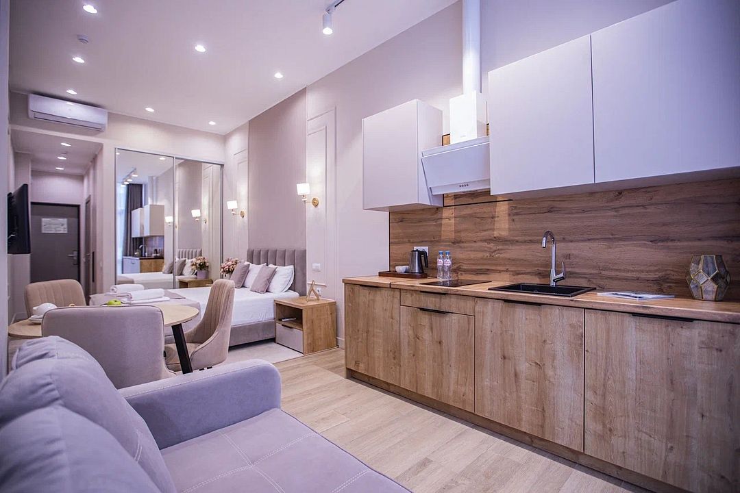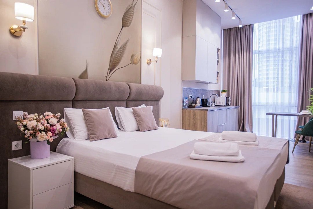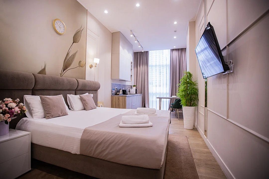 Однокомнатные апартаменты с роскошным интерьером. Дизайн выполнен в теплых тонах, располагающих к отдыху. Апартаменты оснащены собственной ванной комнатой и кухонной зоной. В номере располагается двухспальная кровать и двухспальный мягкий диван. Номер оснащен всем необходимым для комфортного проживания.Апартаменты Студия (корпус "Лотус")