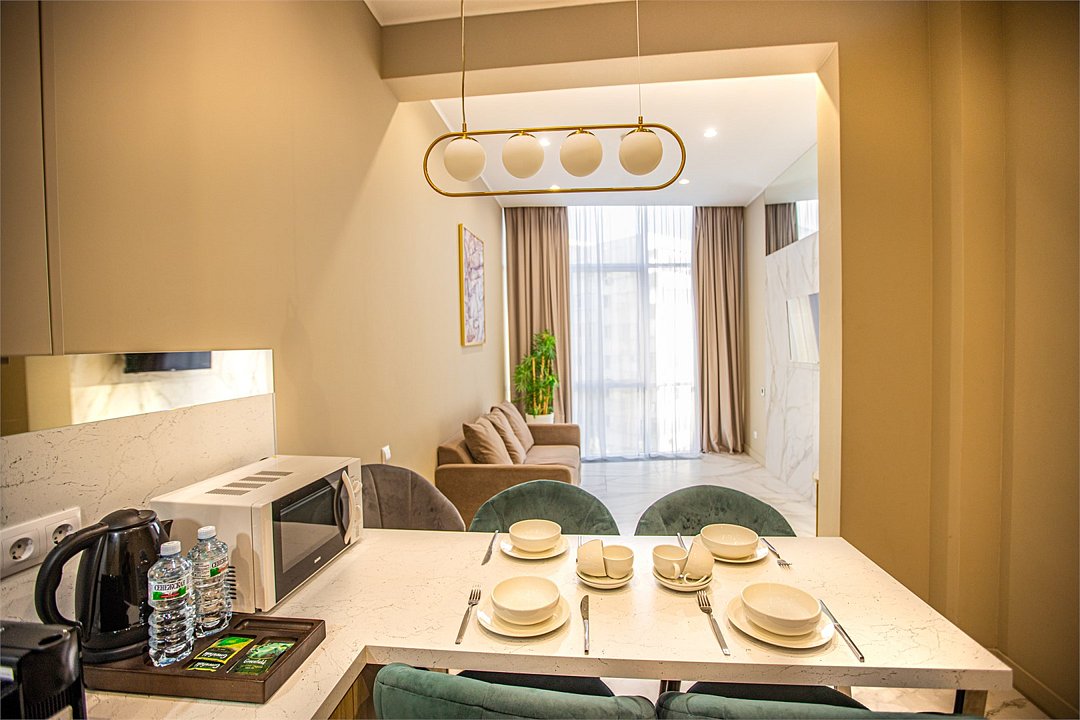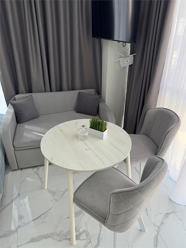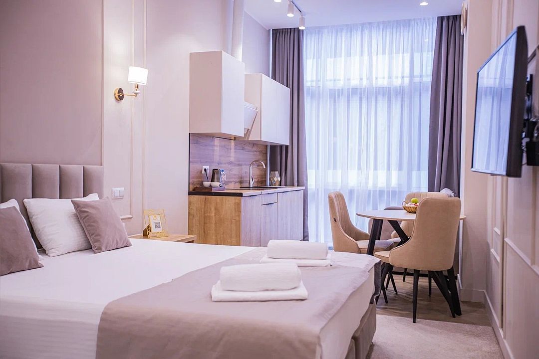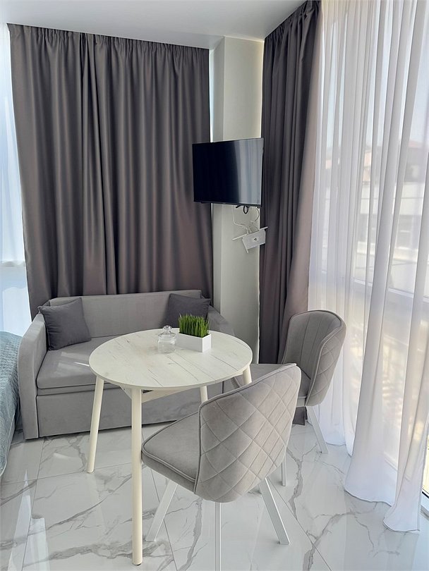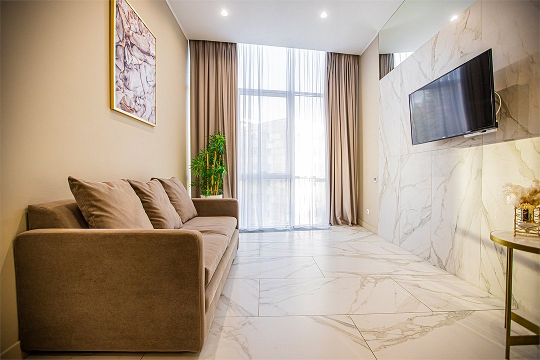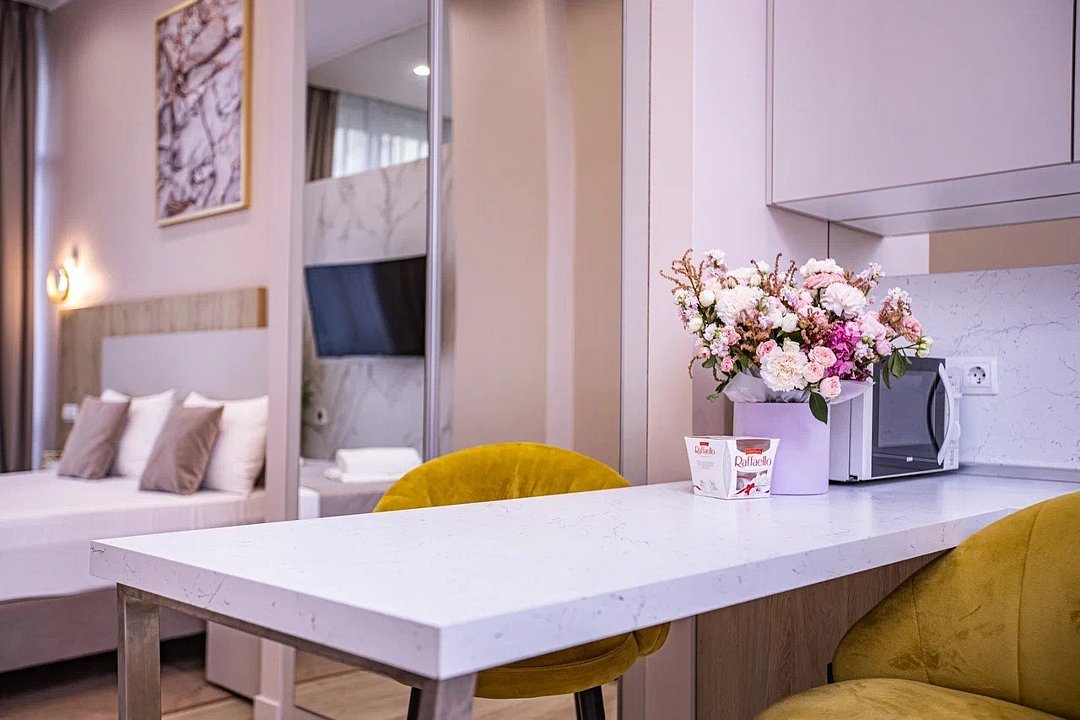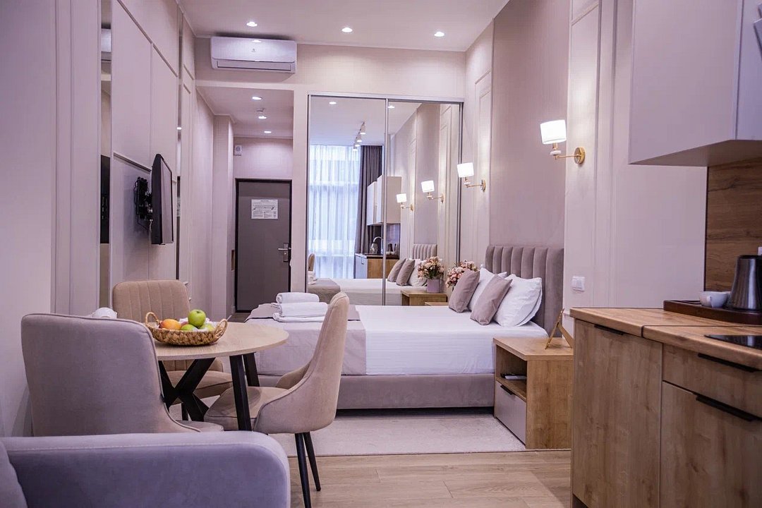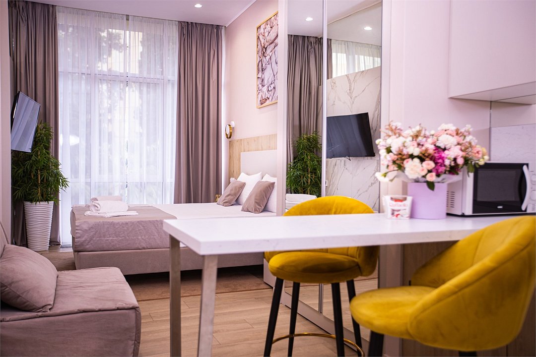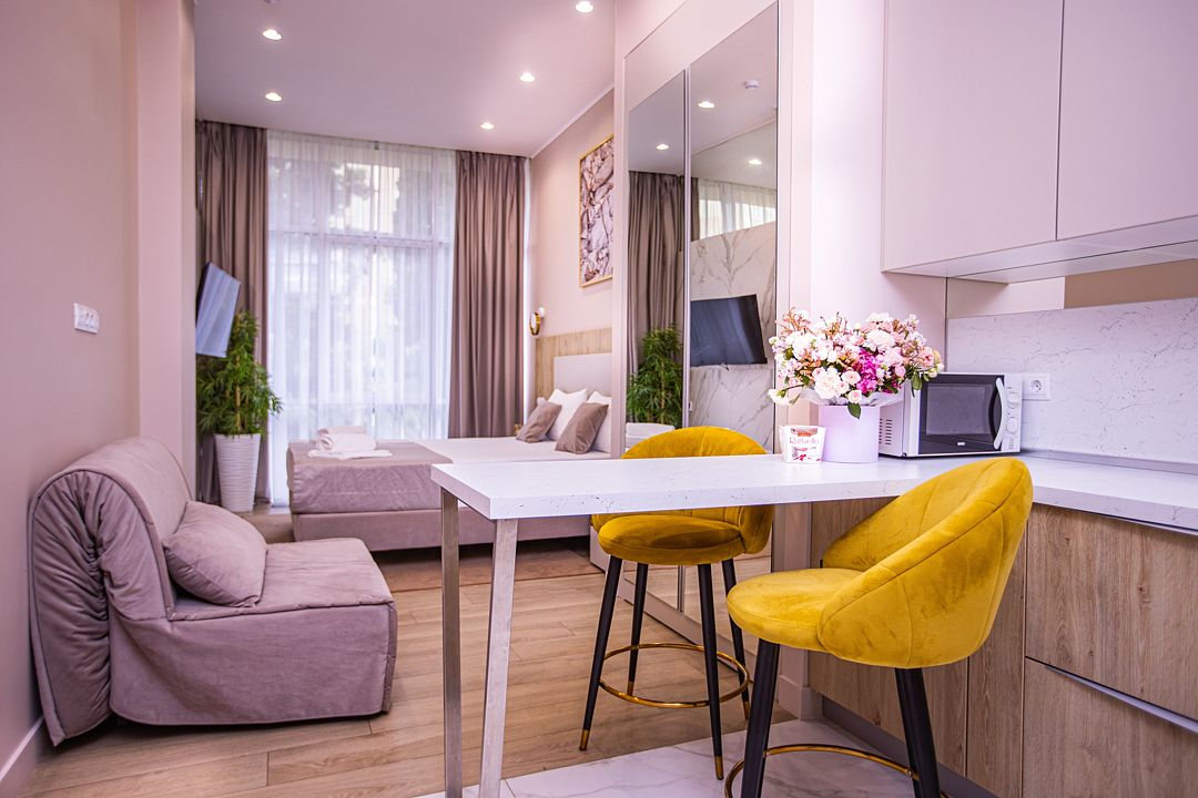 Однокомнатные апартаменты с роскошным интерьером. Дизайн выполнен в теплых тонах, располагающих к отдыху. Апартаменты оснащены собственной ванной комнатой и кухонной зоной. Для 3-х местного размещения - мягкое кресло, 4-х местное - мягкий двухспальный диван. Номер оснащен всем необходимым для комфортного проживания.Услуги и удобства