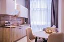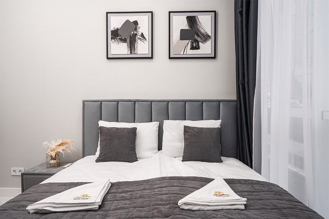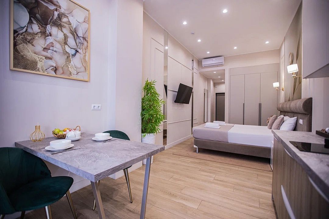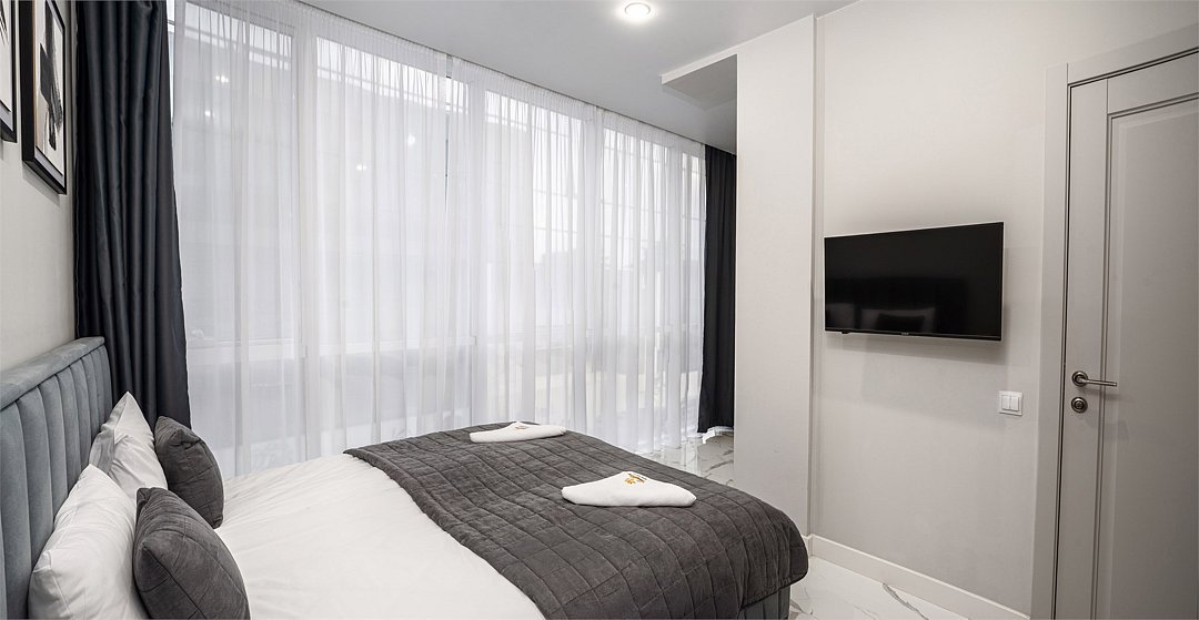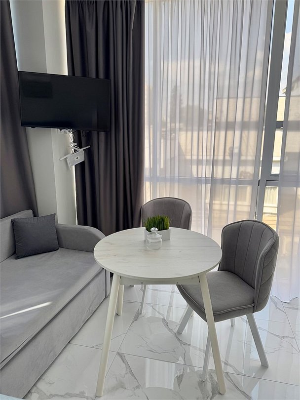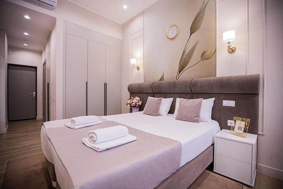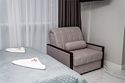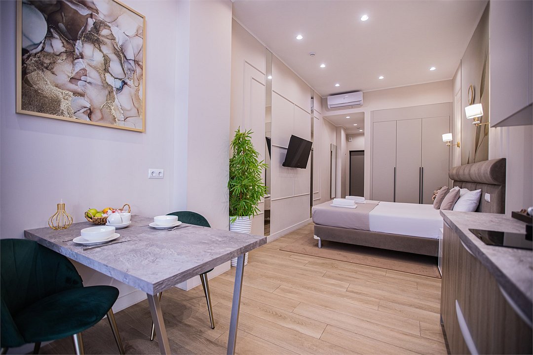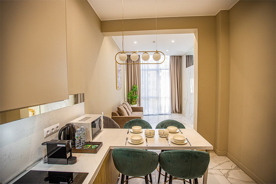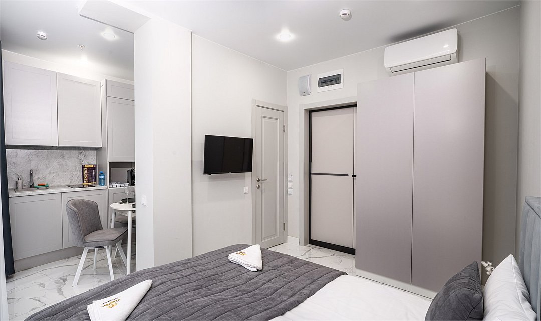 Однокомнатные апартаменты с роскошным интерьером. Дизайн выполнен в теплых тонах, располагающих к отдыху. Апартаменты оснащены собственной ванной комнатой и кухонной зоной. Для 3-х местного размещения - мягкое кресло, 4-х местное - мягкий двухспальный диван. Номер оснащен всем необходимым для комфортного проживания.Услуги и удобства
