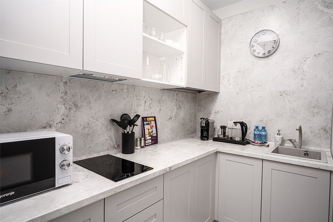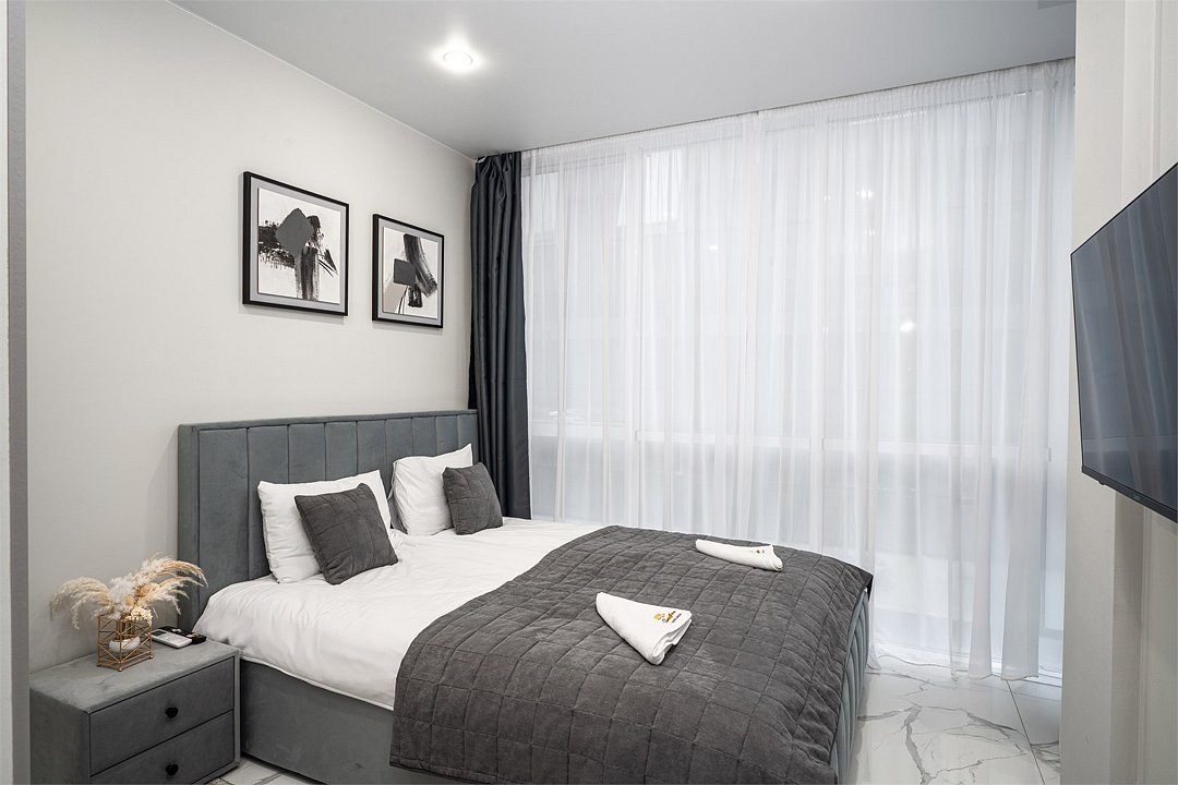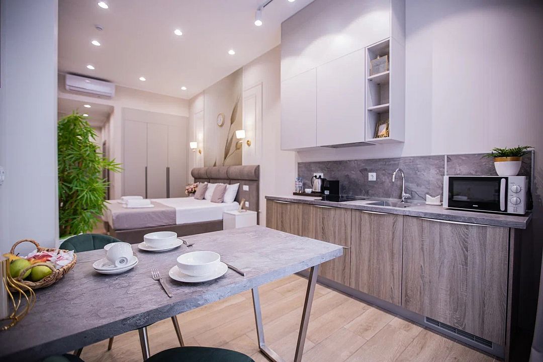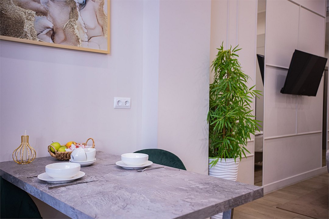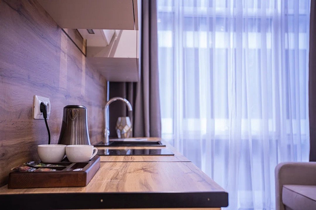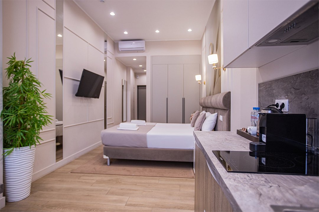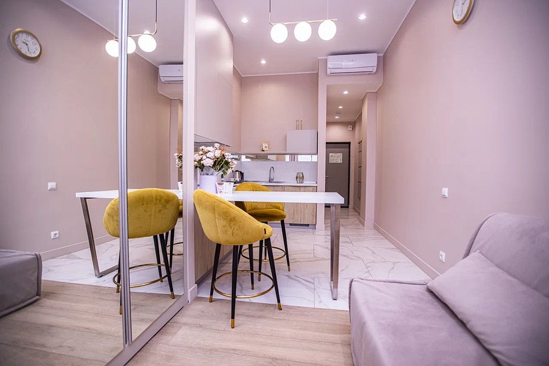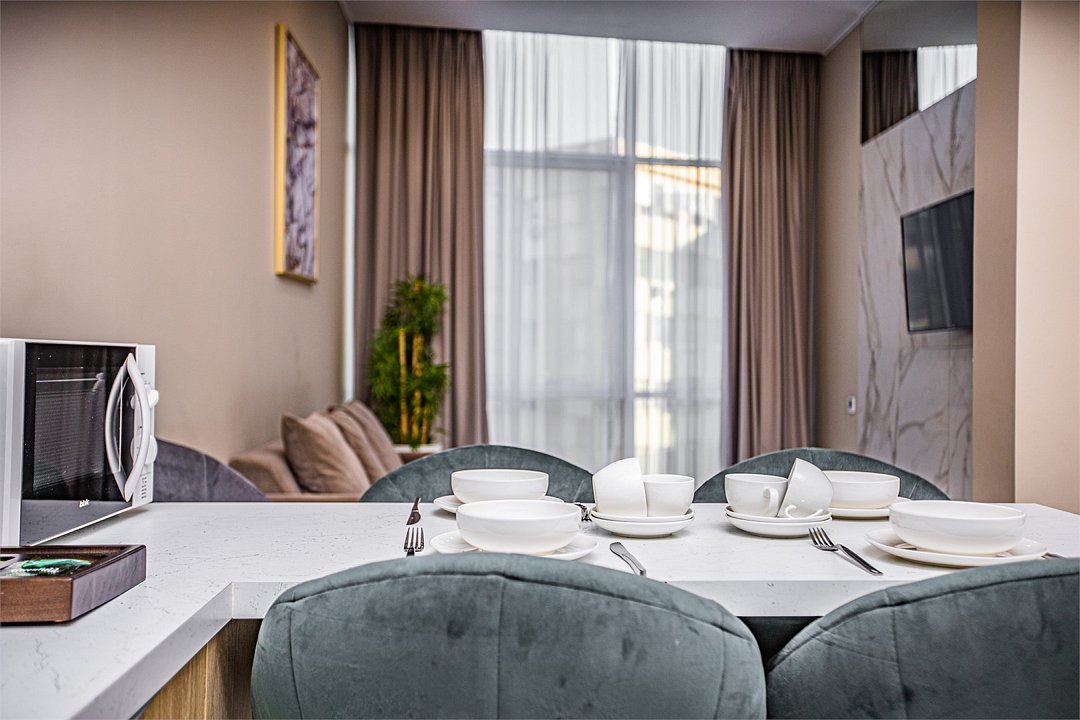 Однокомнатные апартаменты с роскошным интерьером. Дизайн выполнен в теплых тонах, располагающих к отдыху. Апартаменты оснащены собственной ванной комнатой и кухонной зоной. Для 3-х местного размещения - мягкое кресло, 4-х местное - мягкий двухспальный диван. Номер оснащен всем необходимым для комфортного проживания.Услуги и удобства