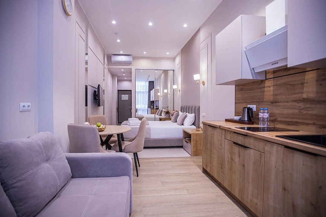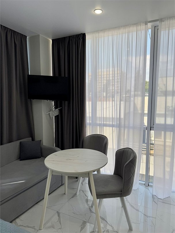 Однокомнатные апартаменты Полулюкс с роскошным интерьером и изумительным видом на центральную улицу в самом сердце города Сочи - Навагинскую. Дизайн выполнен в теплых тонах, располагающих к отдыху. Апартаменты оснащены собственной ванной комнатой. Уютное кресло поможет Вам расслабиться вечером с интересной литературой в руках, а также организовать дополнительное место для одного гостя. Номер оснащен всем необходимым для комфортного проживания.Услуги и удобства