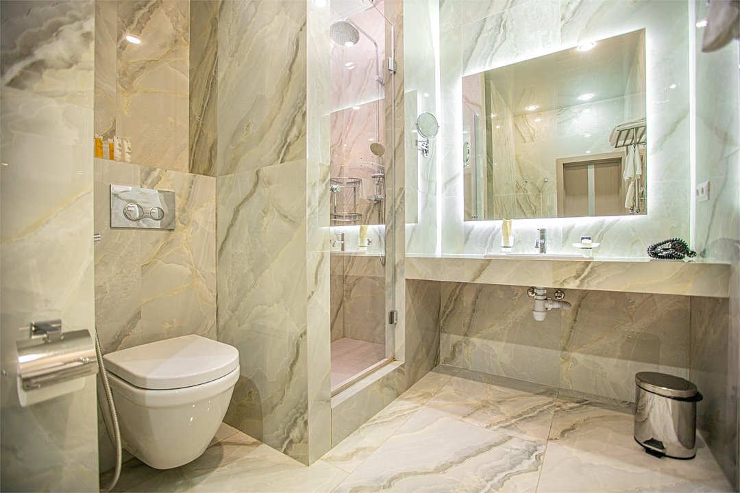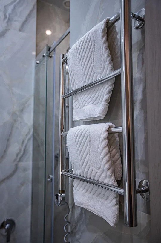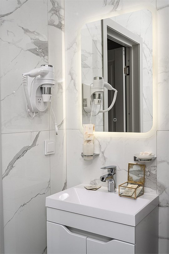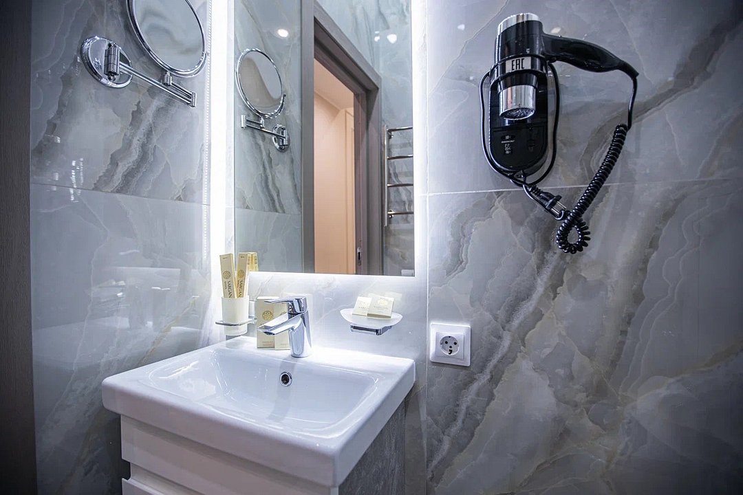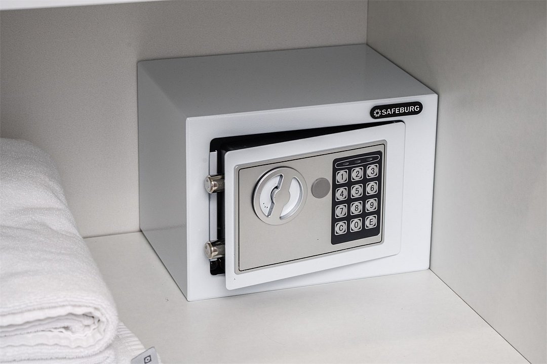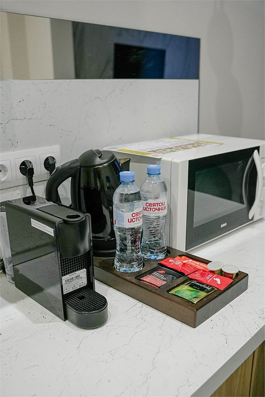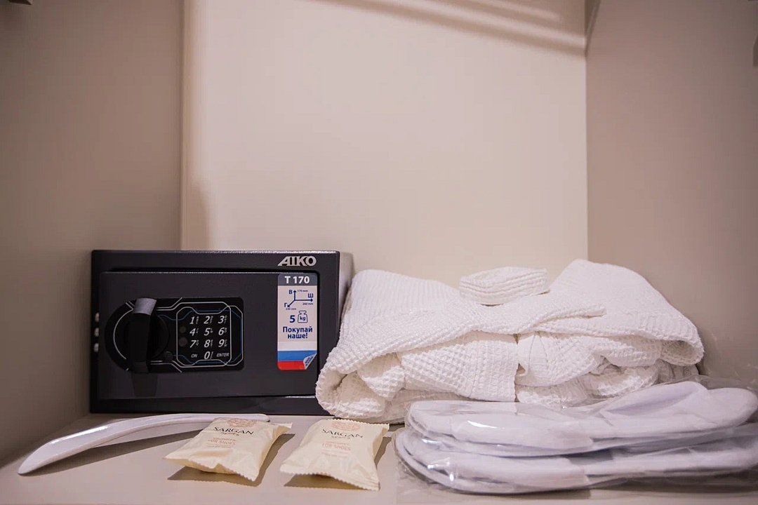 Wi-Fi, холодильник, светильник, фен, электронные замки, кофемашина, микроволновая печь, утюг, банные принадлежности, халаты, тапочки, гигиенические средства, косметические средства, кровать «Queen size», обеденный стол, кухня, сейф, сплит-система, мансардные окна, телевизор со Smart TV, фанкойлВ гостиничном номере