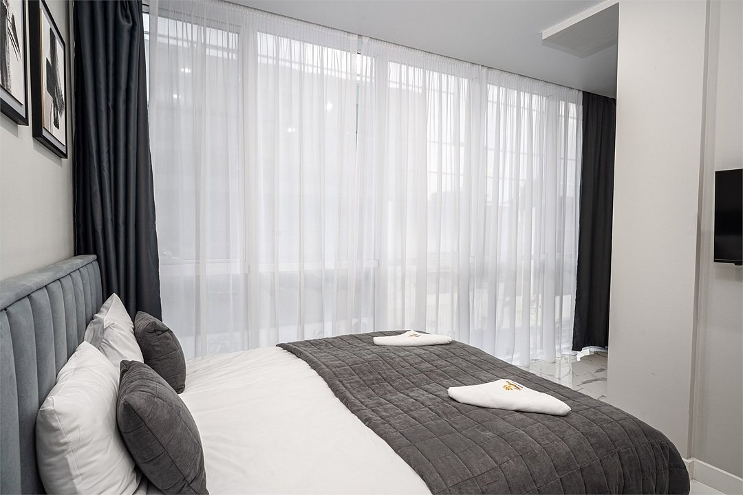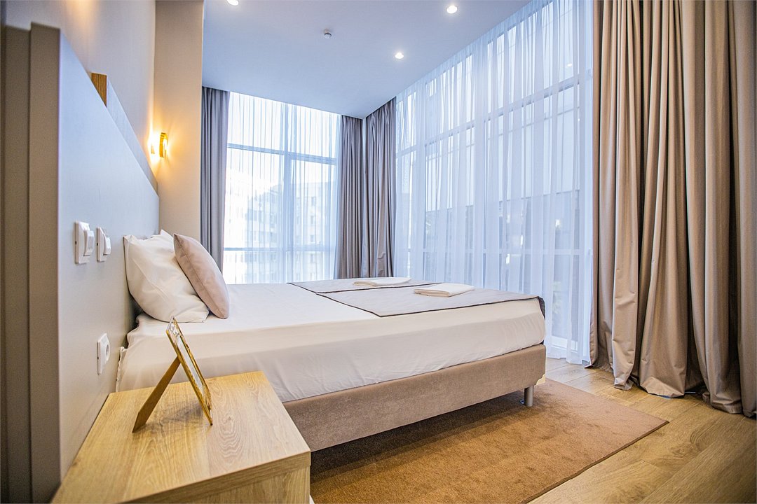 Двухкомнатные апартаменты с роскошным интерьером. Дизайн выполнен в теплых тонах, располагающих к отдыху. Апартаменты оснащены собственной ванной комнатой и кухонной зоной. В номере панорамные окна с видом на главную улицу большого Сочи - Навагинскую. Номер оснащен всем необходимым для комфортного проживания до 4-х человек.Услуги и удобства