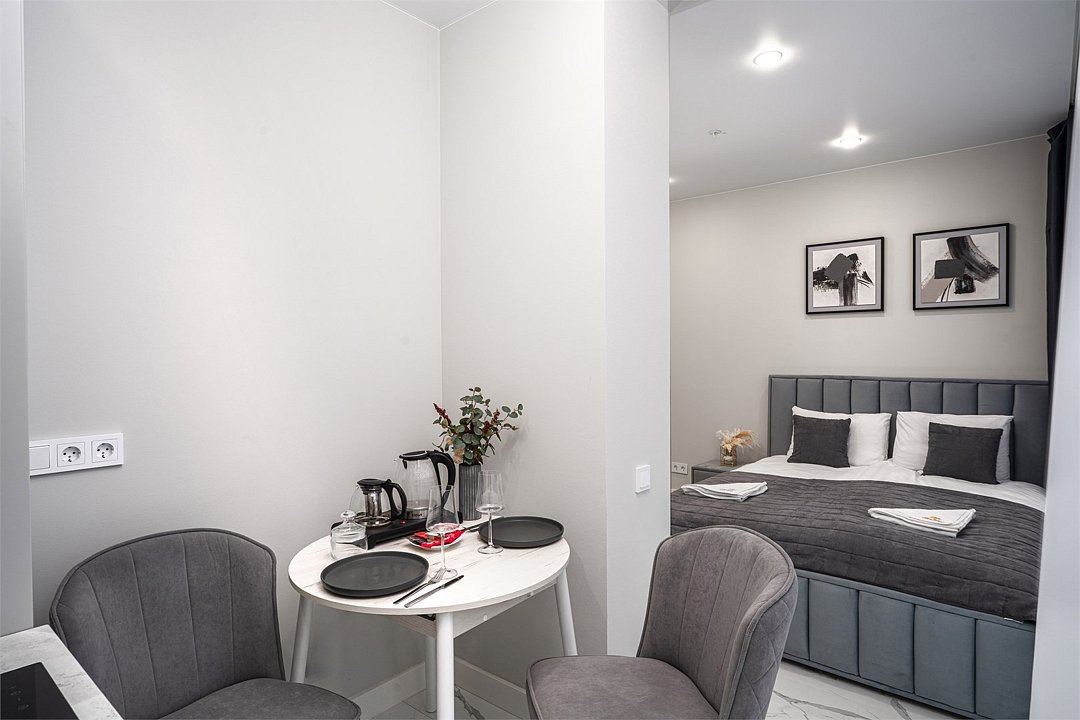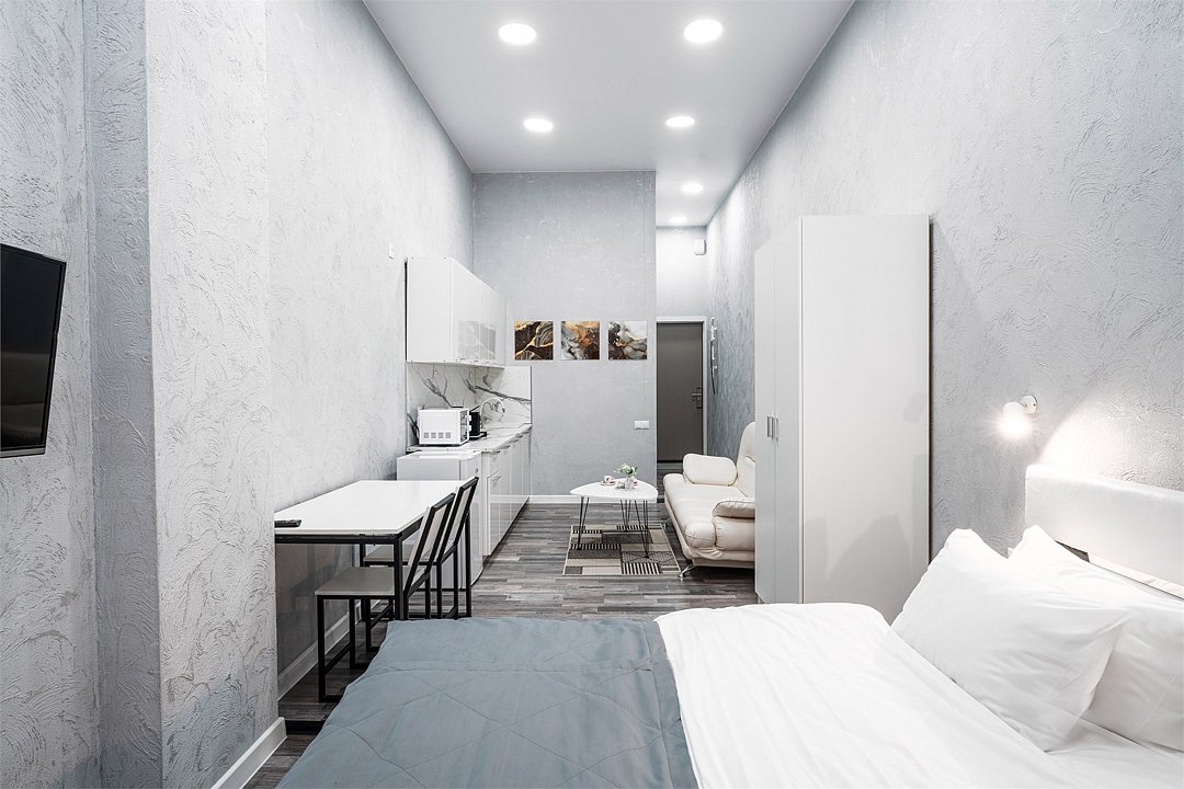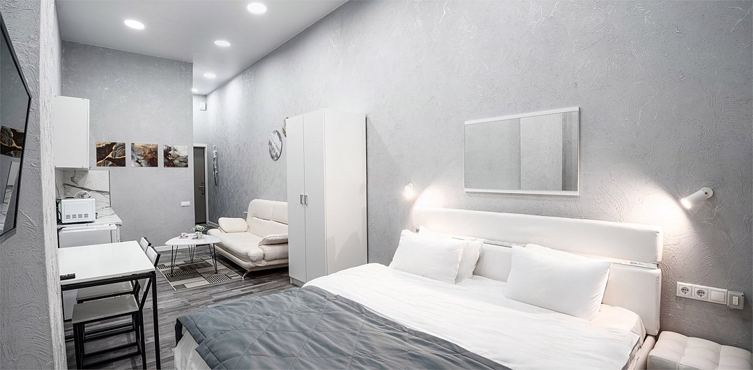 Однокомнатные апартаменты делюкс с роскошным интерьером. Дизайн выполнен в теплых тонах, располагающих к отдыху. Апартаменты оснащены собственной ванной комнатой, кухней и зоной отдыха. Окна выходят на тихую сторону улицы Островского - что позволит Вам уединиться от шума городской суеты. Номер включает в себя всё необходимое для комфортного проживания.Услуги и удобства