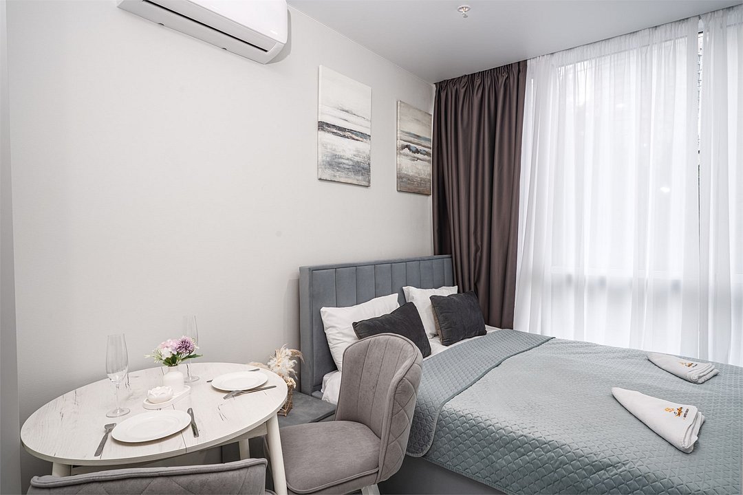 Однокомнатные апартаменты с роскошным интерьером. Дизайн выполнен в теплых тонах, располагающих к отдыху. Апартаменты оснащены собственной ванной комнатой и кухонной зоной, а также собственной террасой. В номере панорамные окна,что позволяет создать уютную обстановку без шума городской суеты. Номер оснащен всем необходимым для комфортного проживания.Стандарт Супериор (корпус "Лотус")