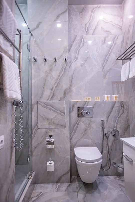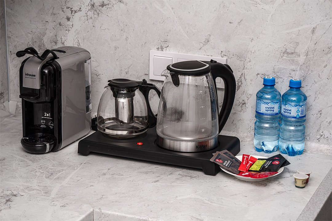 холодильник, фен, плита для приготовления пищи, кофемашина, микроволновая печь, утюг, водонагреватель, халаты, тапочки, гигиенические средства, косметические средства, раковина, душ, кулер на этаже, туалетные средства, туалет, сплит-система, туалетные принадлежности премиум-класса, мылоВ гостиничном номере