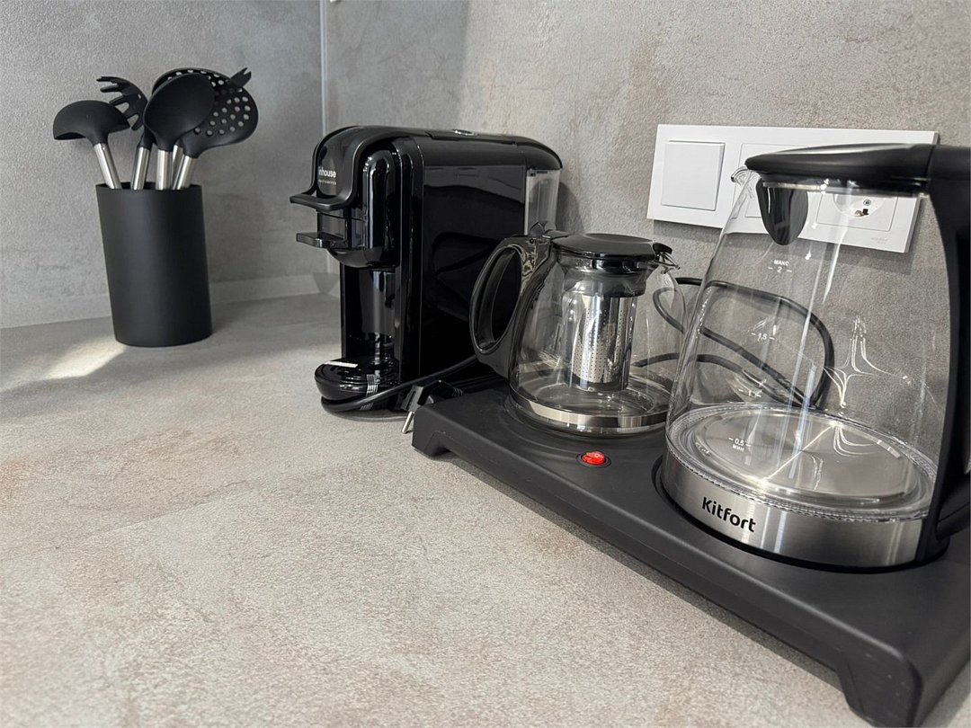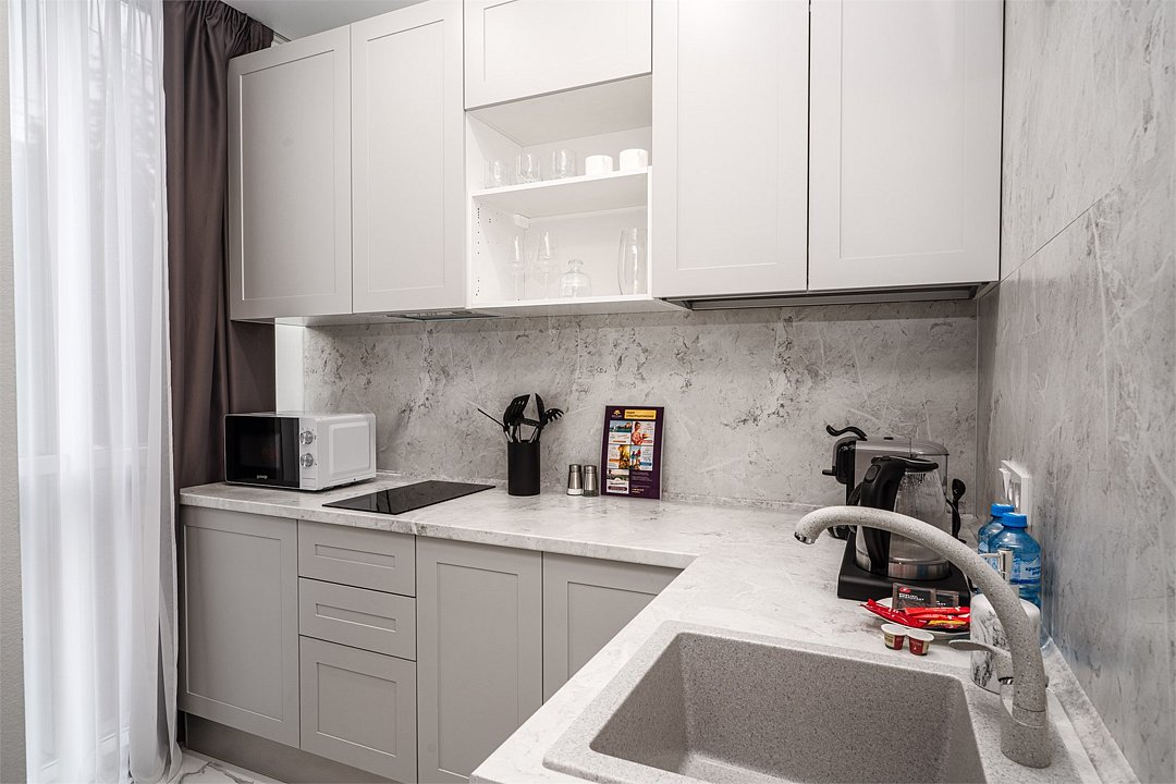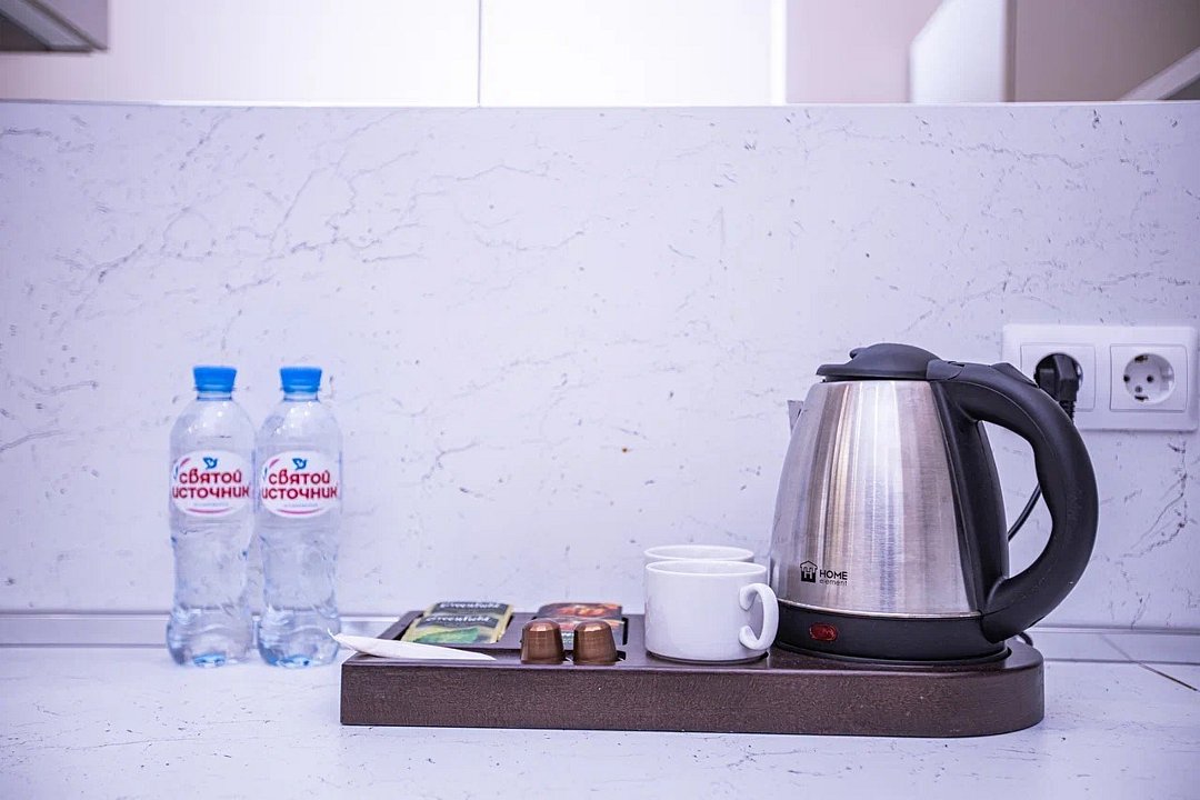 - Укомплектованные номера: ТВ, мебель, кухонная зона, посуда, мини-холодильник, чайный набор;