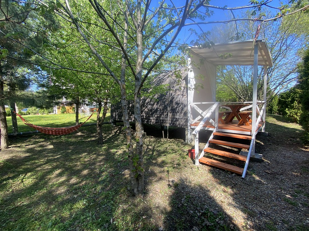 Рядом с домиком находится камачок, мангальная зона и веранда, поэтому всё необходимое для комфортного отдыха на свежем воздухе — буквально в нескольких шагах. Это идеальное место для тех, кто ценит тишину, приватность и атмосферу уюта, но при этом гости могут пользоваться всей большой территорией комплекса и всеми доступными развлечениями.