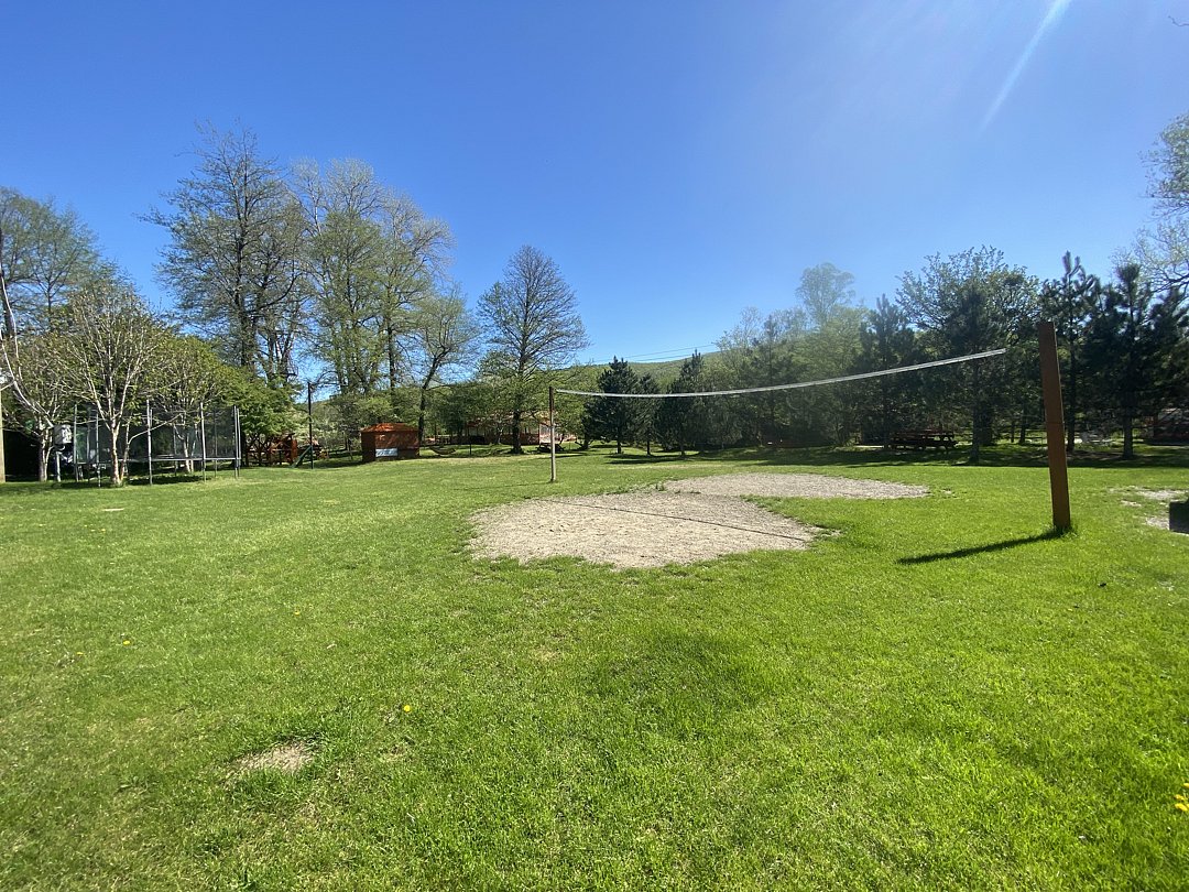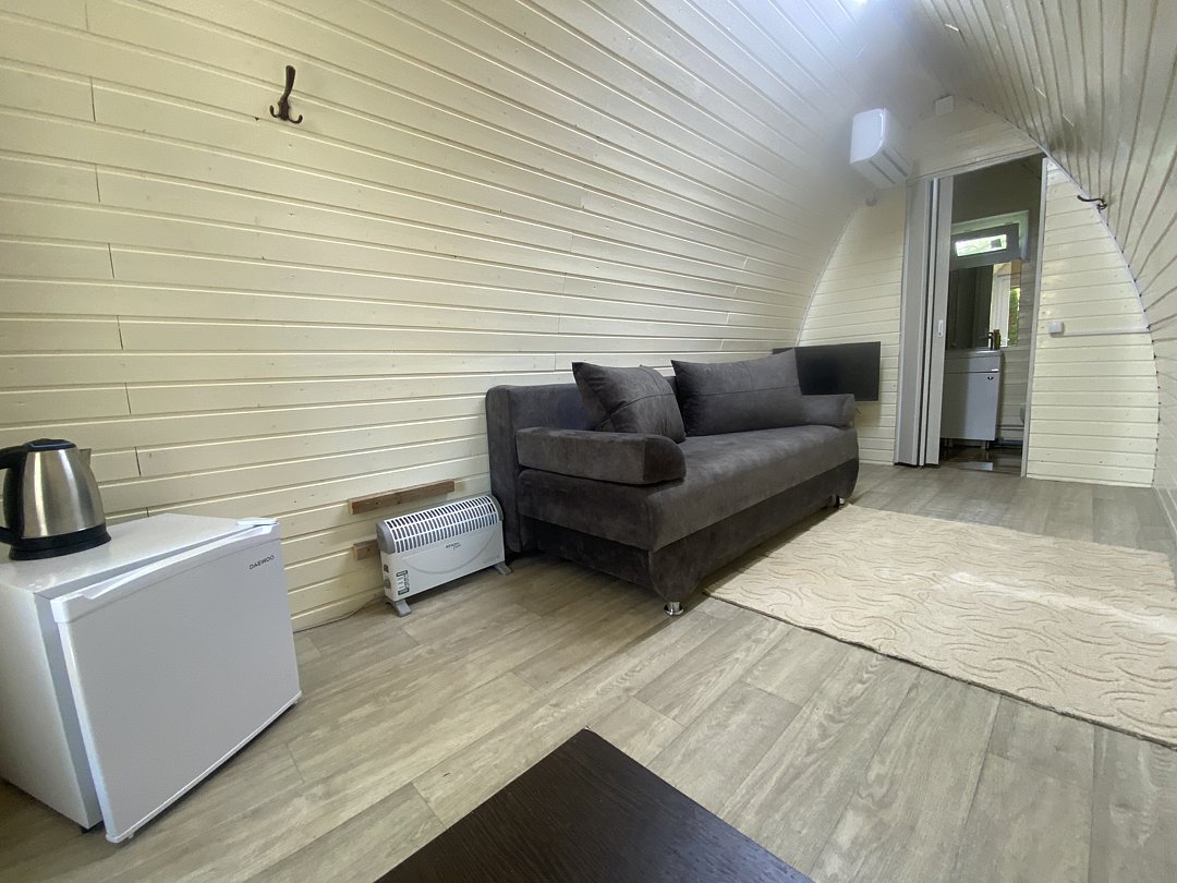 Рядом находится мангальная зона, а также зелёная полянка, на которой можно играть в футбол и другие активные игры. Гости могут пользоваться общей кухней: на ней есть плита и микроволновка, а в самом номере — чайник и холодильник.