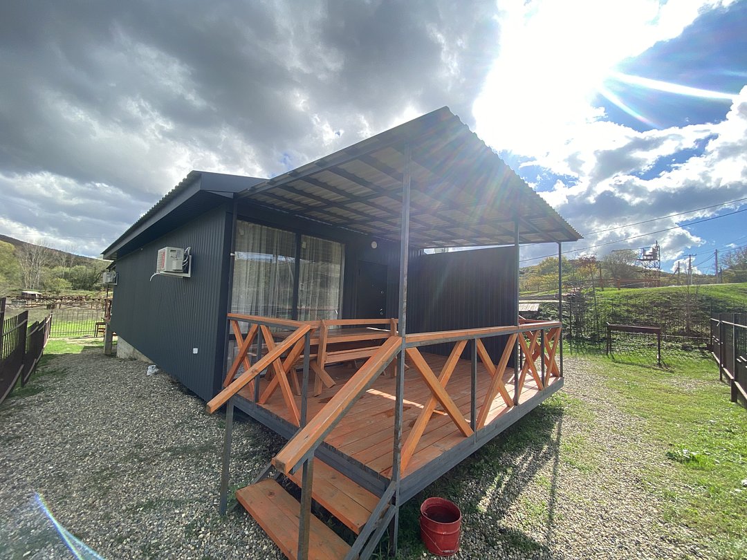 Это уютный отдельно стоящий домик с верандой и большими панорамными окнами в пол, которые при необходимости можно закрыть плотными тёмными шторами. С обратной стороны расположена мангальная зона, а рядом находится просторная поляна, идеально подходящая для проведения мероприятий, активных игр и отдыха на свежем воздухе.