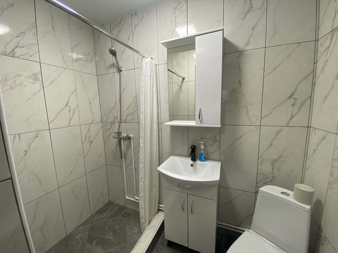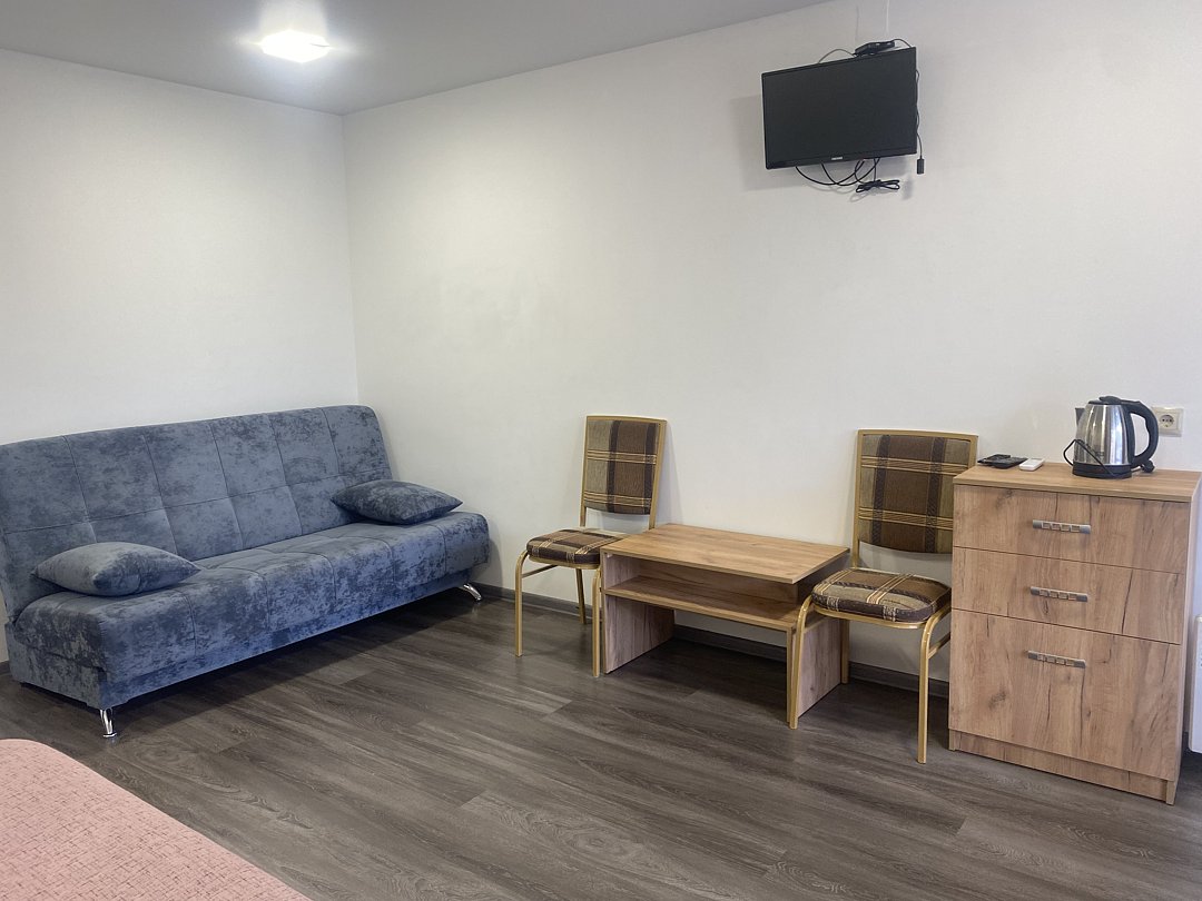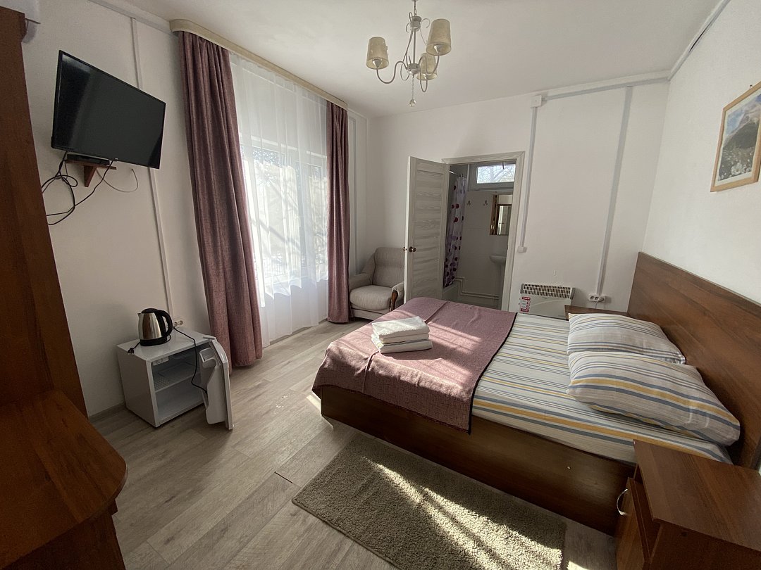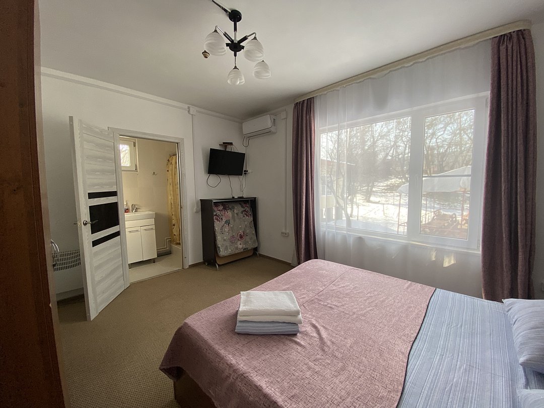 Это однокомнатное размещение с двуспальной кроватью и удобной раскладной кроватью, рассчитанное на комфортное проживание до трёх гостей. В номере есть холодильник, чайник, кондиционер, телевизор. Гости также могут пользоваться общей кухонной зоной: доступна электроплита и микроволновая печь для разогрева или приготовления пищи.