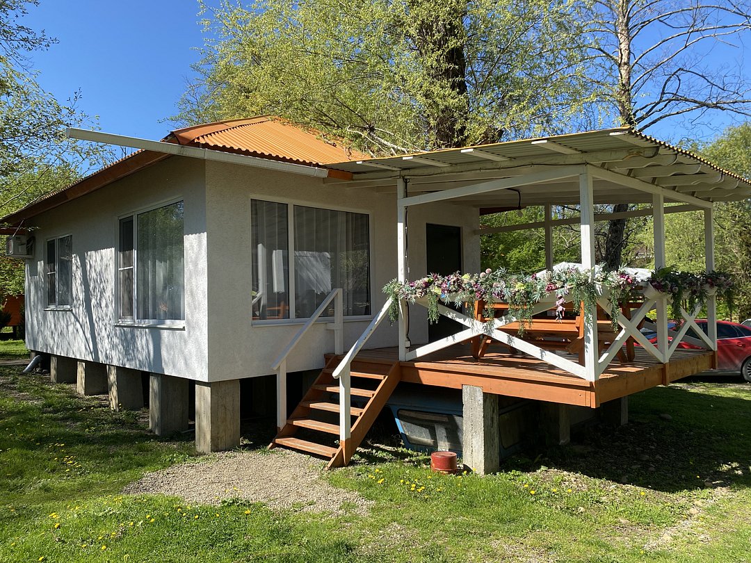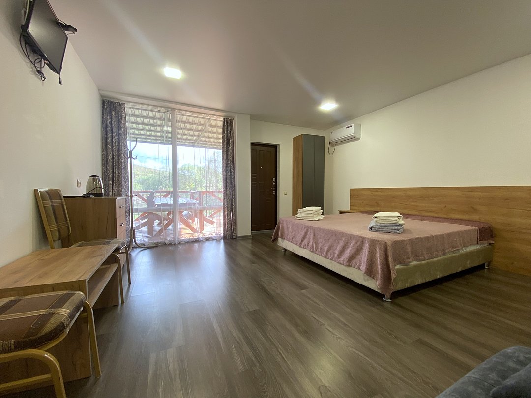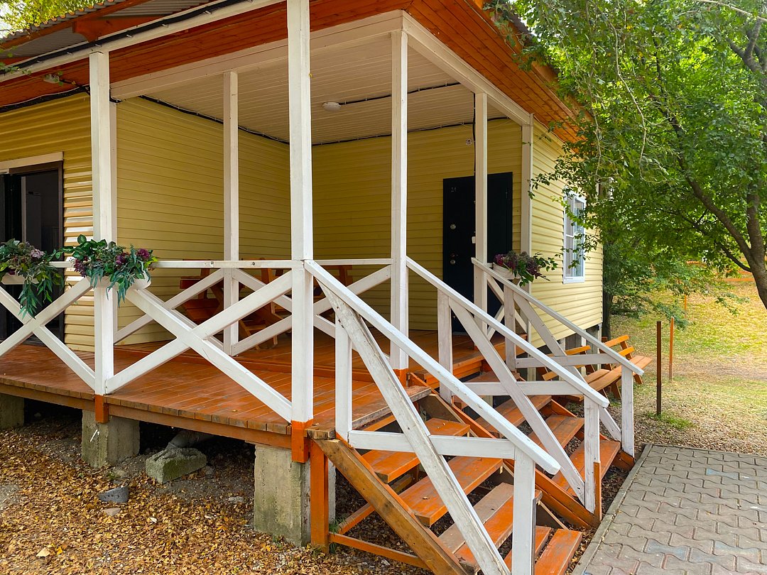 Есть номера с общей просторной верандой на два номера, а также варианты с собственной верандой. При этом у каждого номера отдельный вход, свой санузел, душ, телевизор, чайник, холодильник, кондиционер и обогреватель.