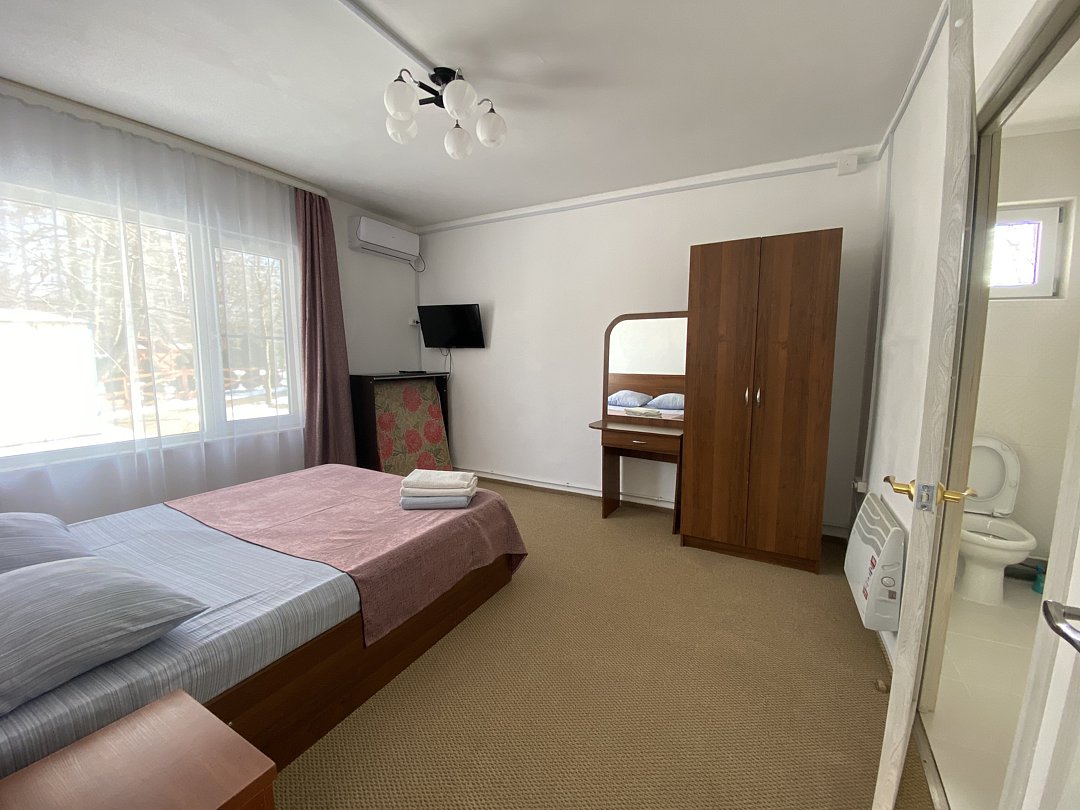 Это комфортабельные номера с двуспальной кроватью и дополнительным местом — удобной тумбой раскладушкой. Варианты размещения различаются: фотографии носят ознакомительный характер, так как номера расположены в разных частях территории и могут немного отличаться по интерьеру.
