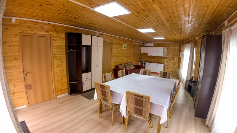 Возле домика находится большая поляна, где удобно проводить время всей компанией, устраивать пикники или играть в активные игры, например в футбол. Если погода будет неблагоприятной, всегда можно комфортно разместиться в просторной гостиной, которая отлично подходит для совместного отдыха.
