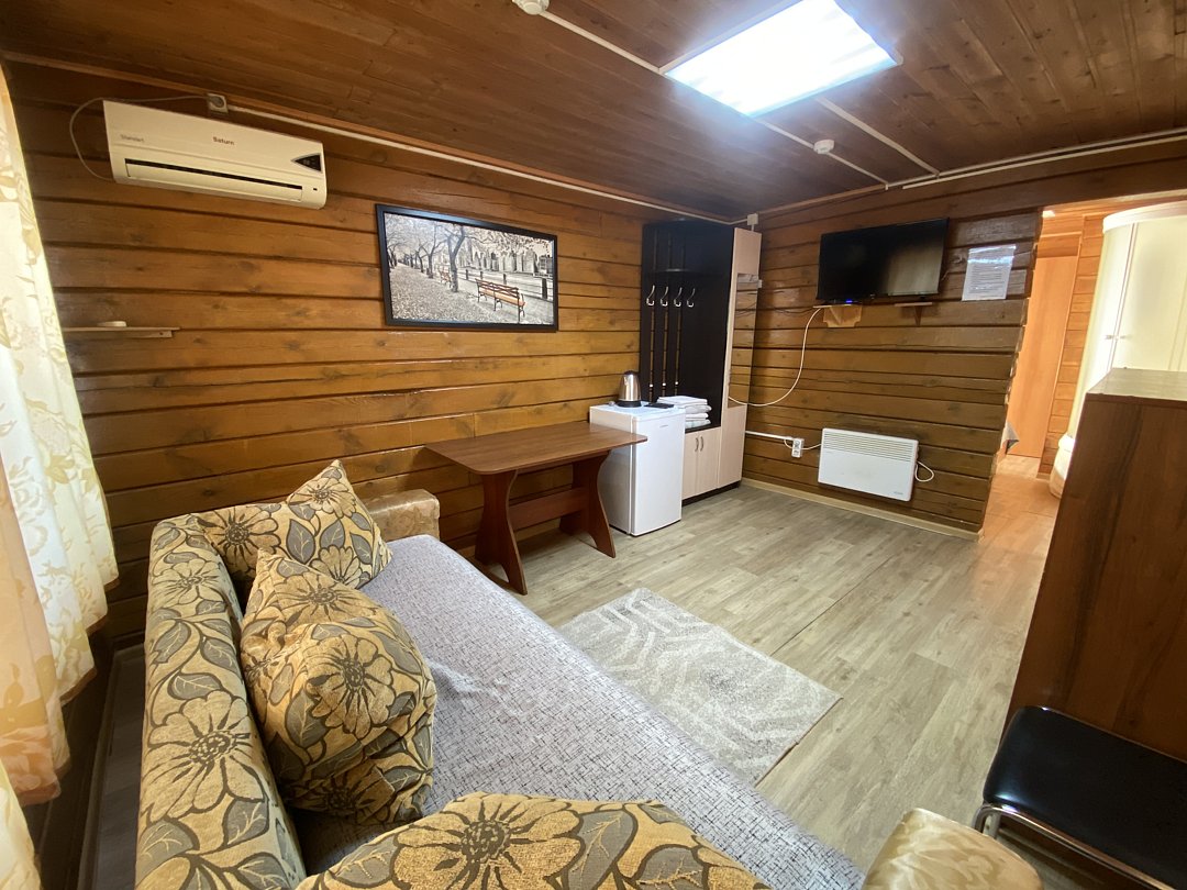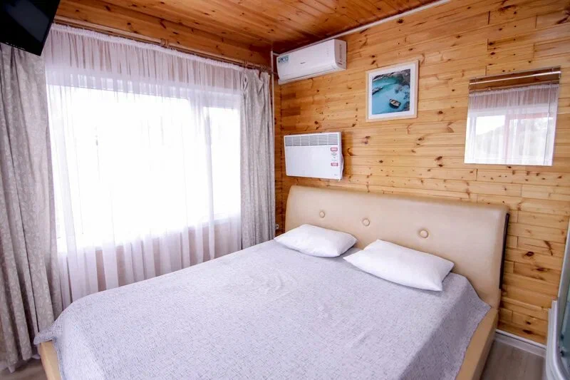 В номере предусмотрены двуспальная кровать и раскладной двуспальный диван. У каждого номера отдельный вход и своя веранда, рядом находится мангальная зона. Парковка расположена в непосредственной близости — автомобиль можно оставить прямо возле домика.