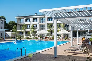 На территории пансионата находится просторный открытый бассейн с подогревом, который обеспечивает комфортное купание в любое время года. Для расслабления гостей предусмотрены два водопада для массажа. Для маленьких посетителей создана специальная зона — детский бассейн, отделённый от основного безопасными перилами для максимальной защиты детей. В центре детского бассейна расположен гейзер, который создает эффект аэромассажа и дарит детям море удовольствия.