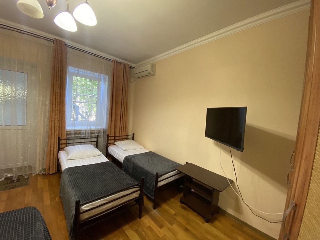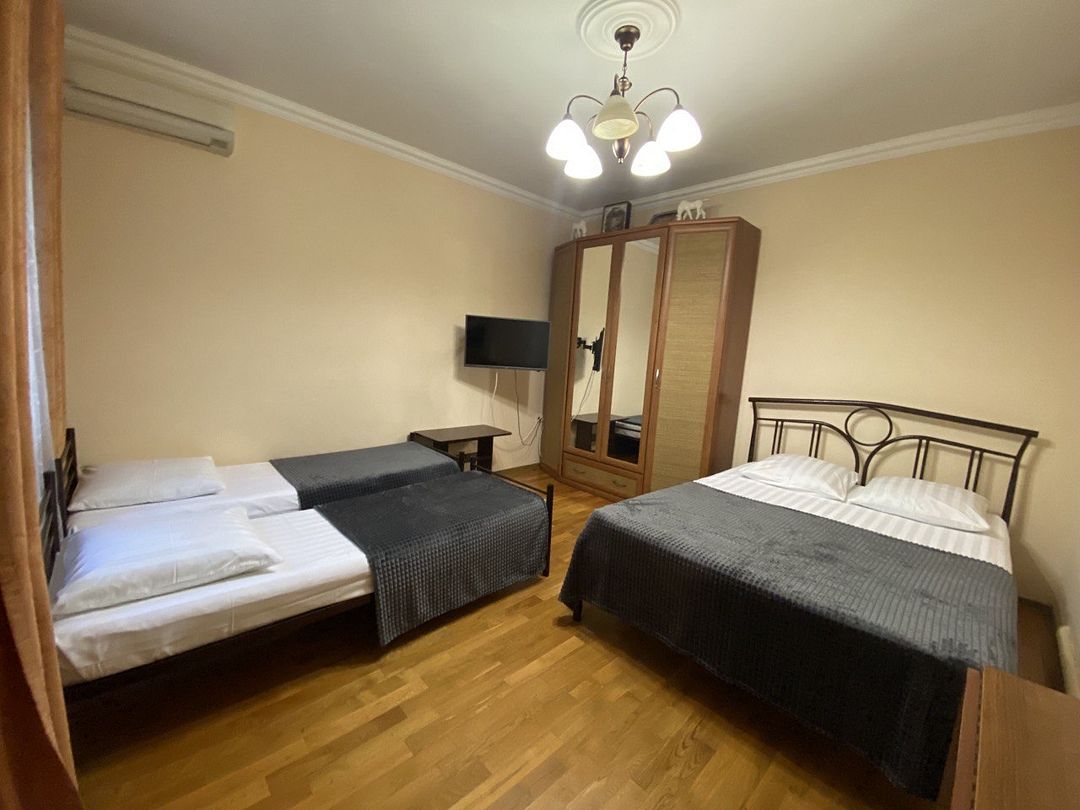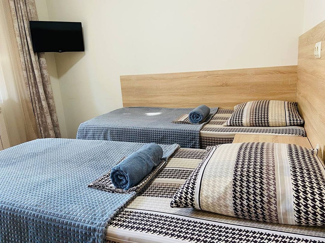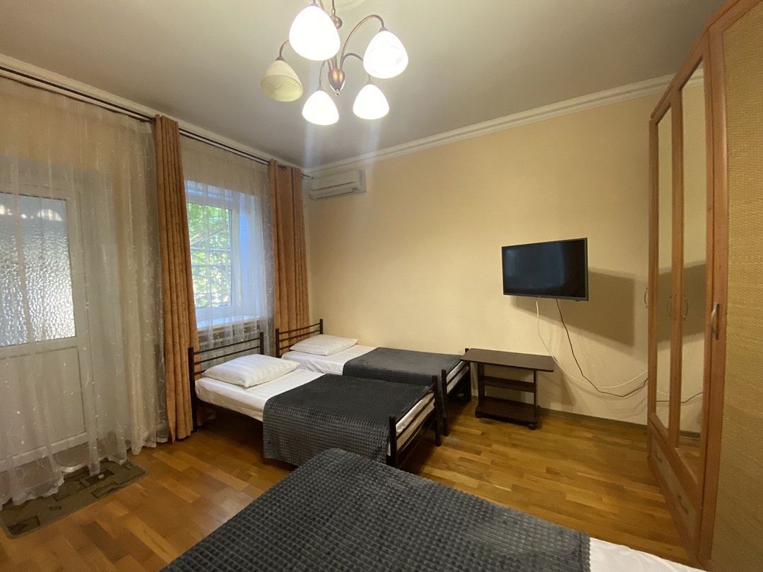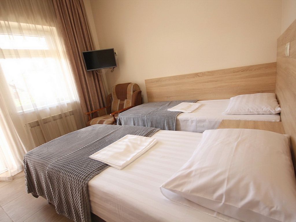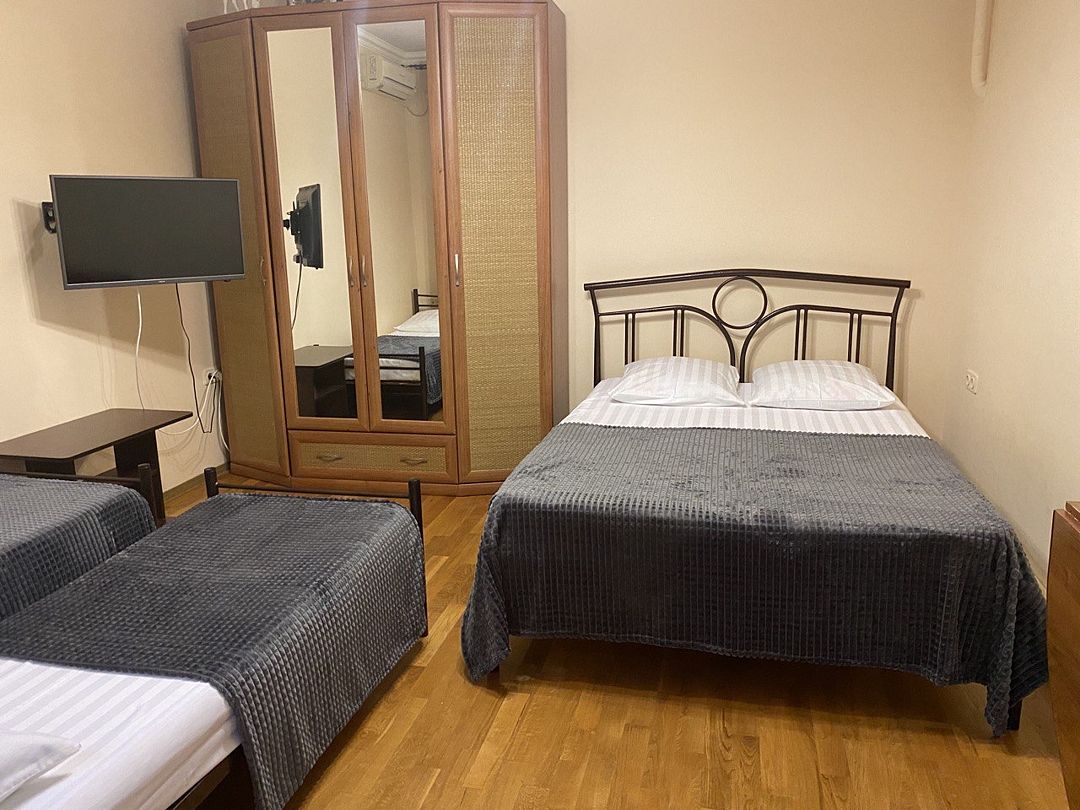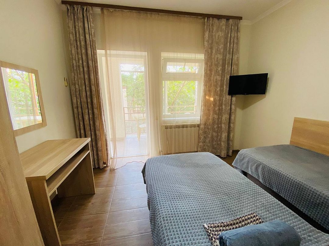 В номере имеется одна двухспальная и две односпальные кровати, телевизор, кабельное ТВ, кондиционер, столик, зеркало, отопление, шкаф, постельное белье и бесплатный Wi-Fi. Также для гостей предусмотрены общая душевая, туалет на этаже на 3 номера и общая кухня, где вы сможете воспользоваться чайником, холодильником, микроволновой печью а так же гладильной доской и утюгом. С каждого номера есть выход на балкон, с которого открывается красивый вид на сад или горы.В гостиничном номере