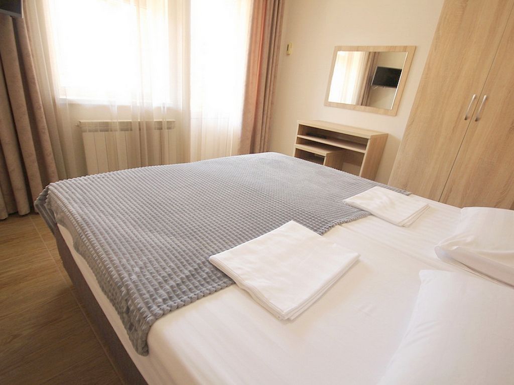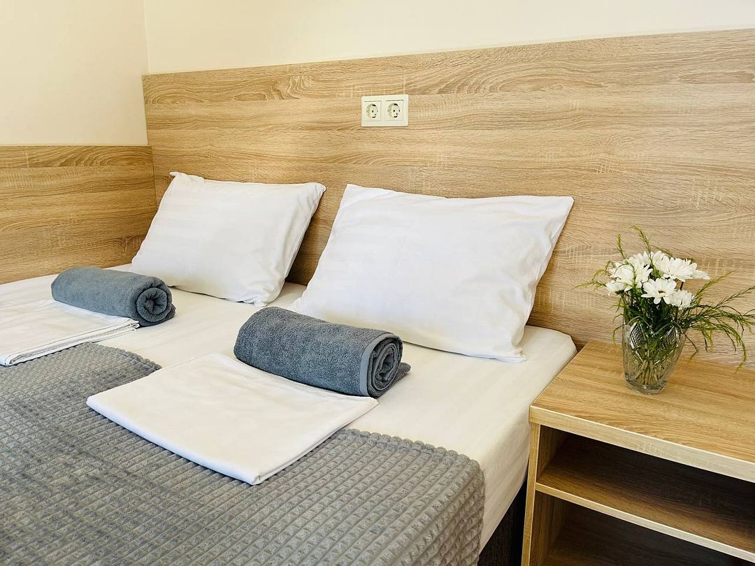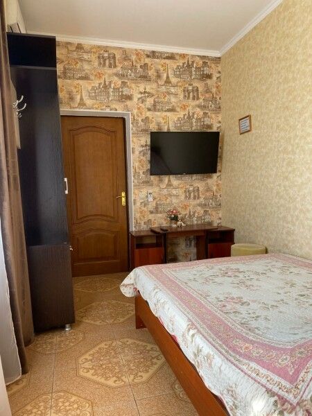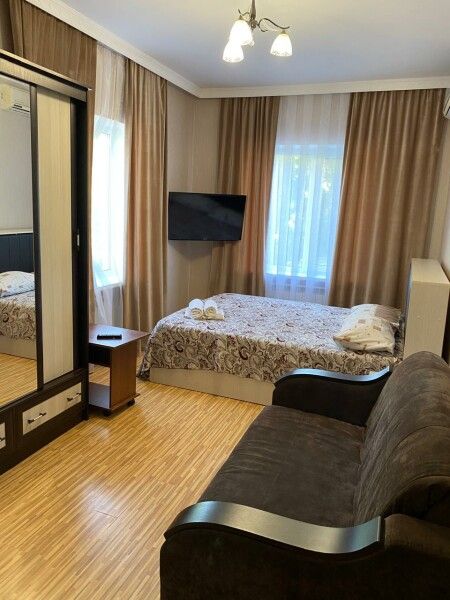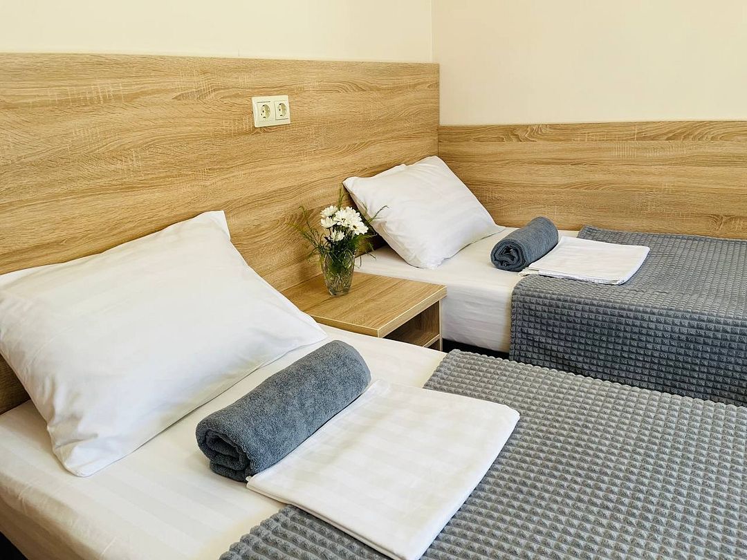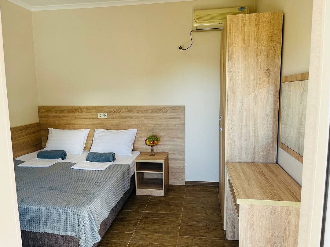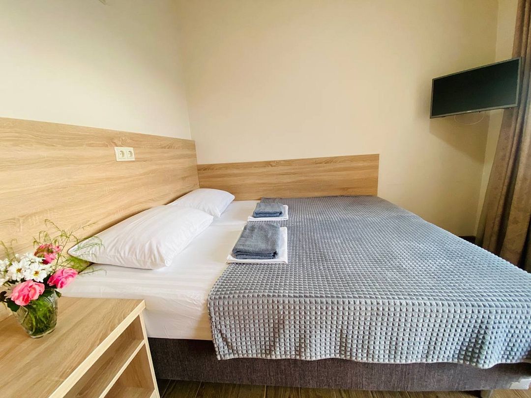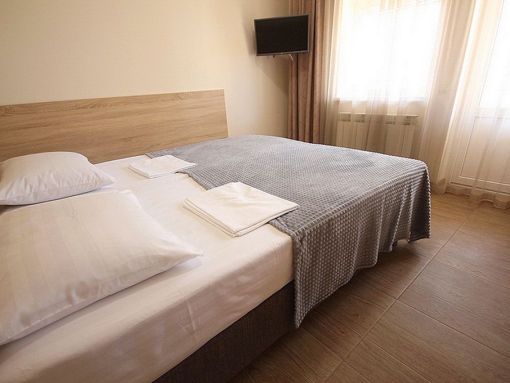 В номере имеется одна двуспальная или две односпальные кровати + раскладное кресло-кровать или раскладушка, телевизор, кабельное ТВ, кондиционер, столик, зеркало, отопление, шкаф, постельное белье. Также для гостей предусмотрены общая душевая, туалет на этаже на 3 номера и общая кухня, где вы сможете воспользоваться чайником, холодильником, микроволновой печью а так же гладильной доской и утюгом. С каждого номера есть выход на балкон, с которого открывается красивый вид на сад или горы.В гостиничном номере