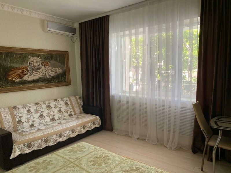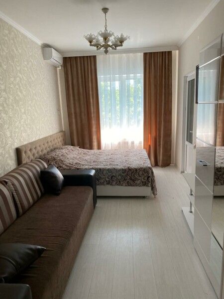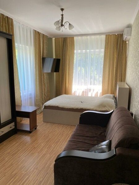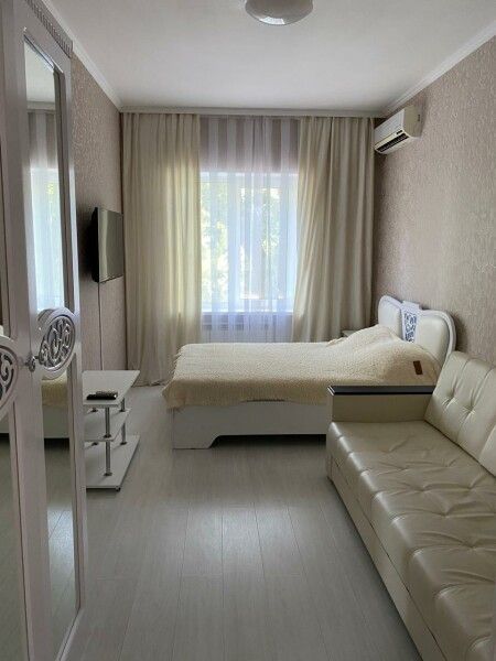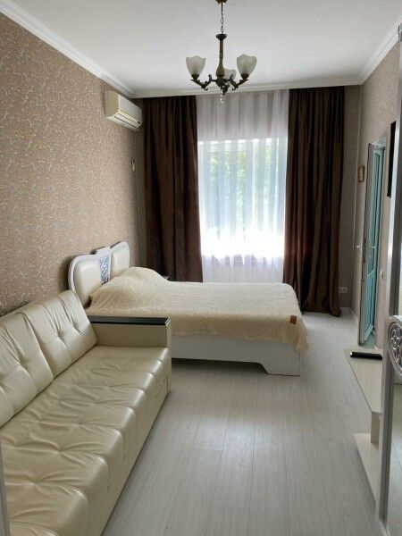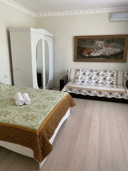 с отдельным входом и собственной террасой. В каждой комнате двуспальная кровать, раскладывающийся диван, шкаф для одежды, тумбочки, пуфик, журнальный столик, обеденный стол со стульями, телевизор, кондиционер, холодильник, фен, современный санузел с душем