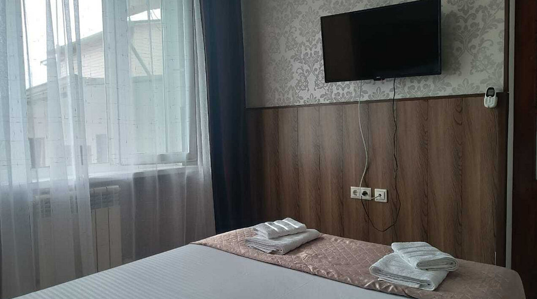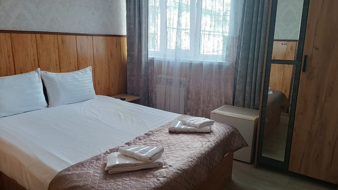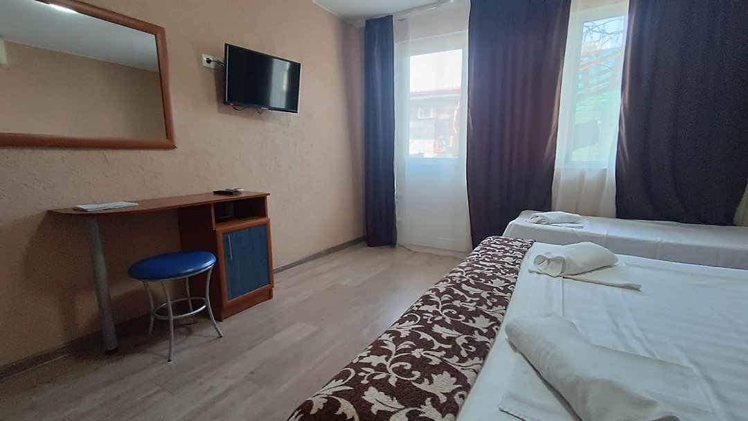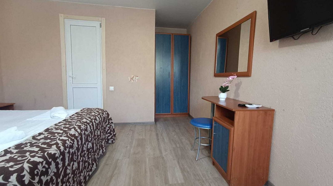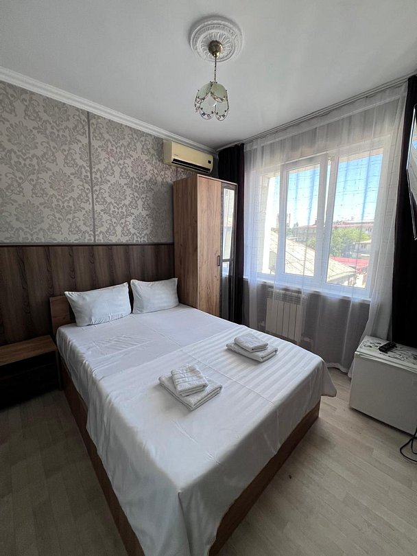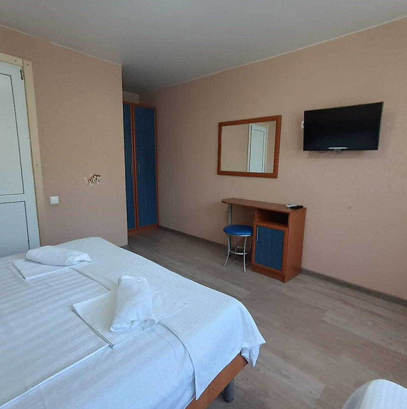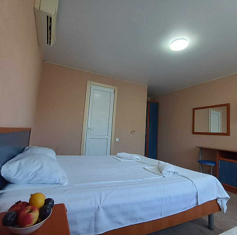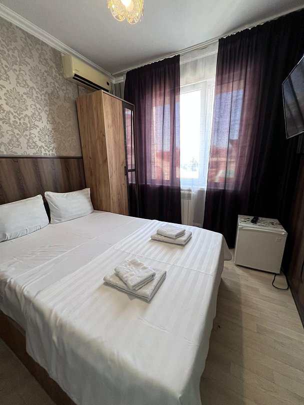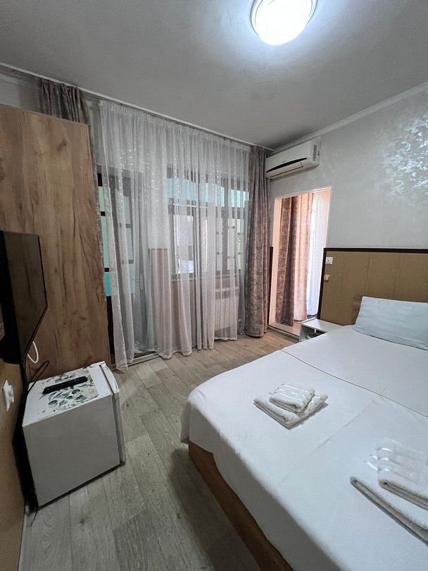 Состоит из: 1 двуспальная кровать, туалет, душ, кондиционер, мини-холодильник (не во всех номерах), телевизор, Wi-Fi. Визуально номера могут отличаться, наполнение одинаковое.