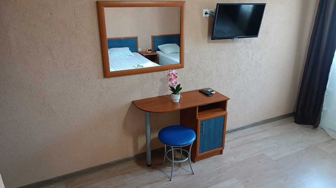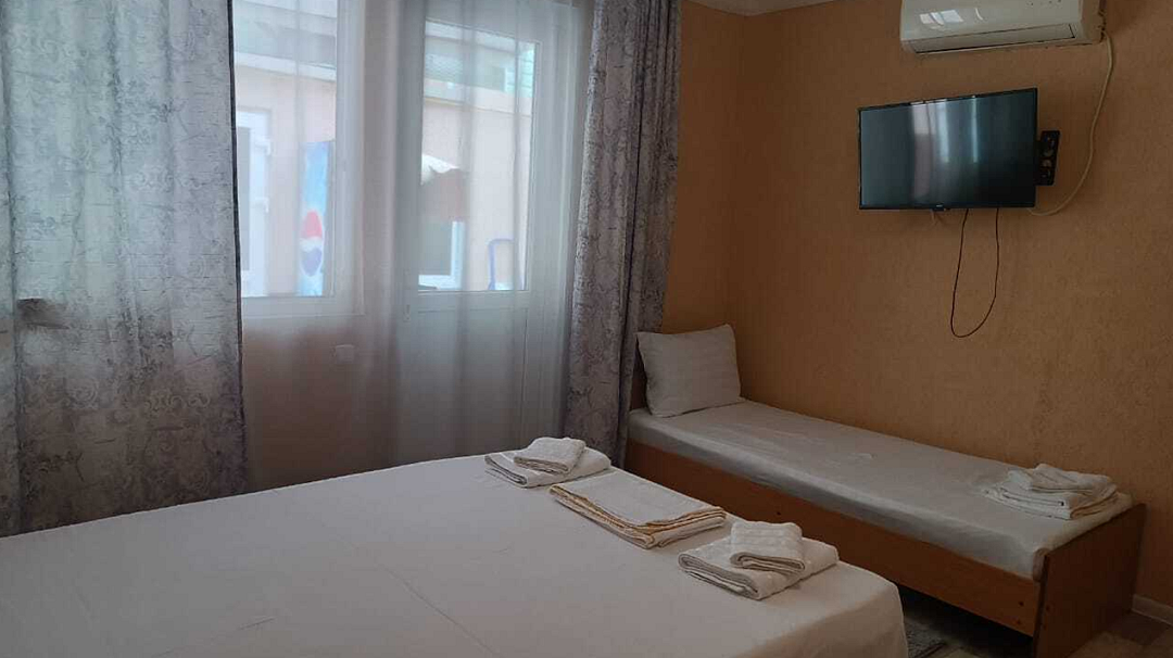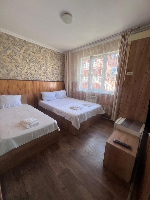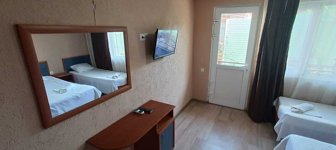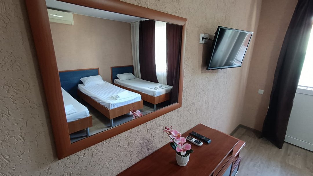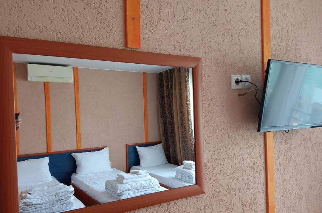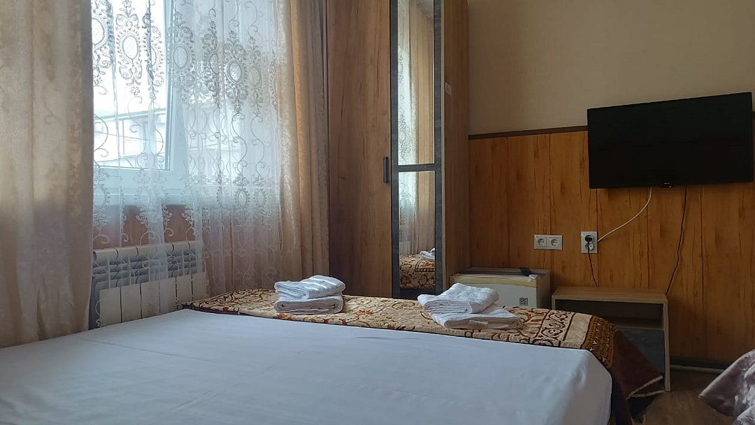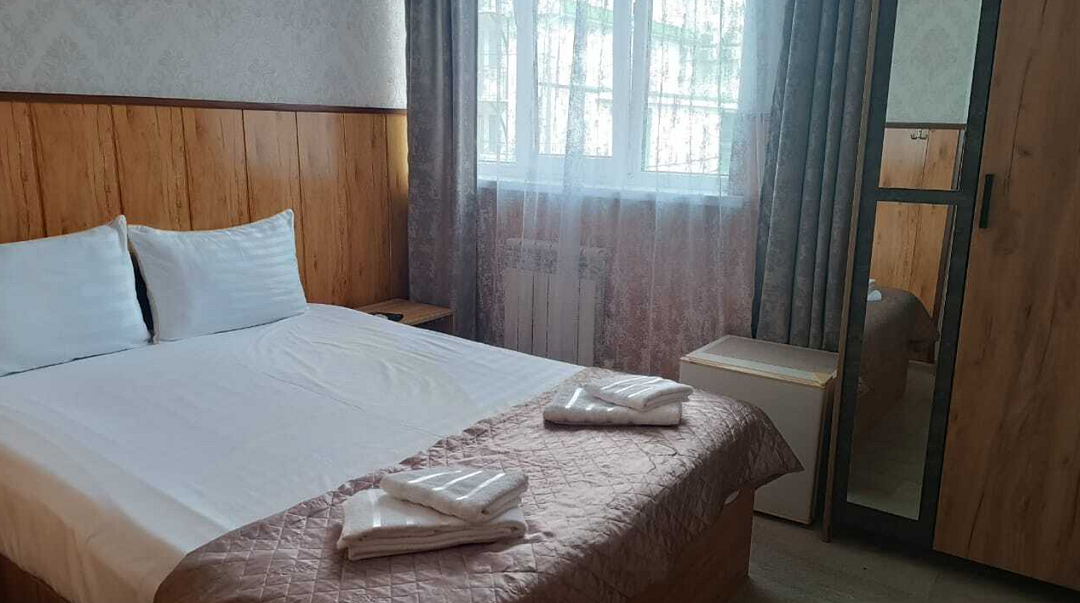 Состоит из: 1 двуспальная кровать, туалет, душ, кондиционер, мини-холодильник (не во всех номерах), телевизор, Wi-Fi. Визуально номера могут отличаться, наполнение одинаковое.