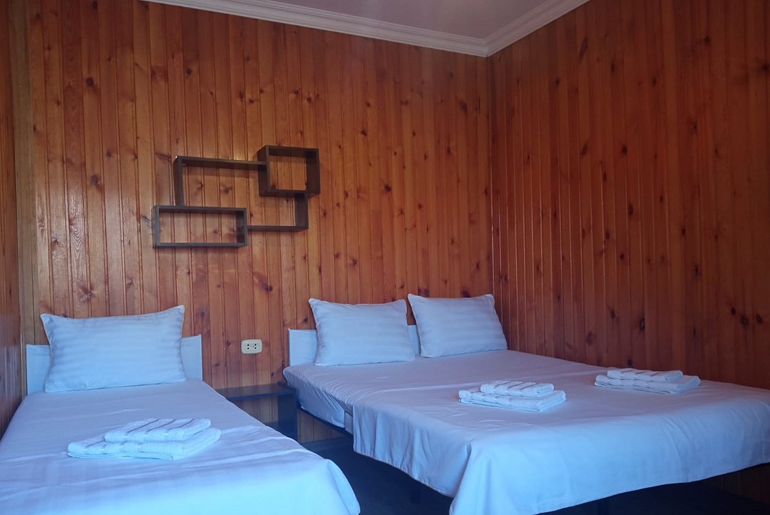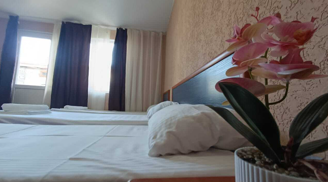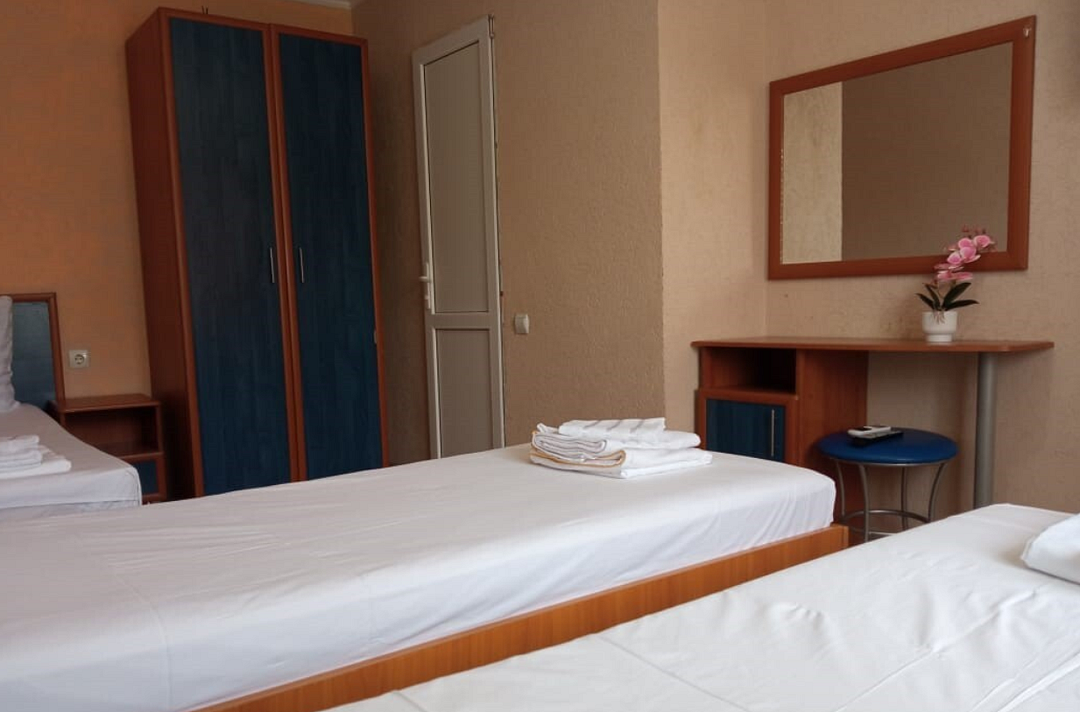 Состоит из: 1 двуспальная кровать, 1 односпальная кровать или 3 односпальные кровати, туалет, душ, кондиционер, мини-холодильник (не во всех номерах), телевизор, Wi-Fi.
