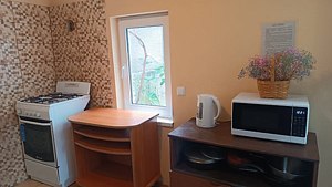 Общая кухня с посудой, газовой плитой, электрочайником, микроволновой печью, холодильником.