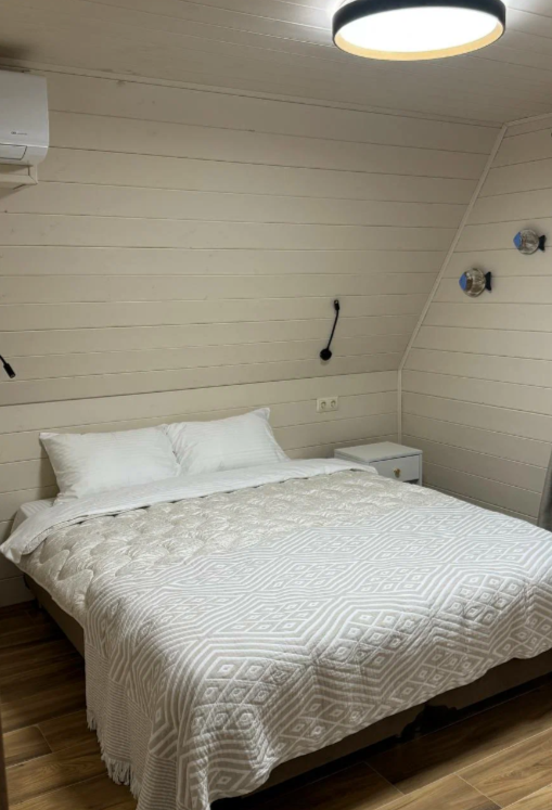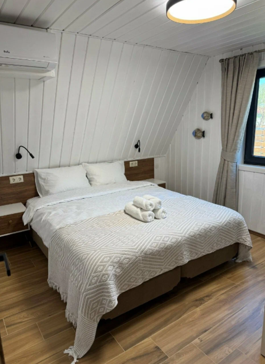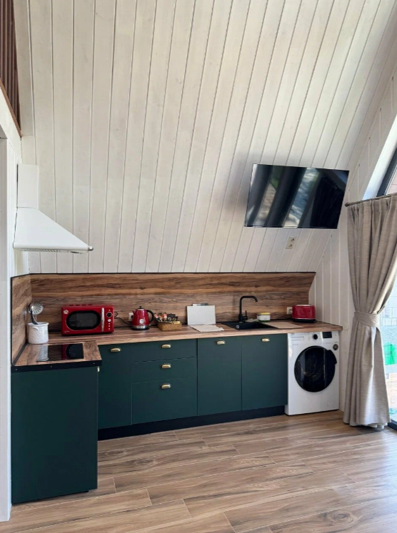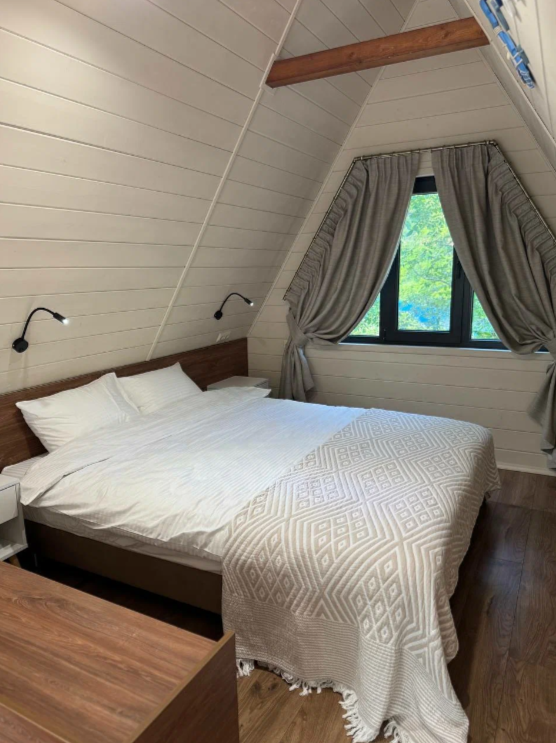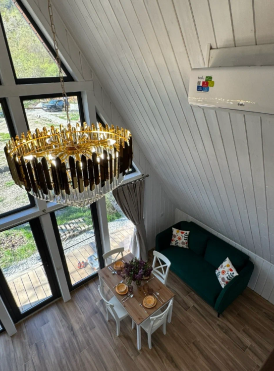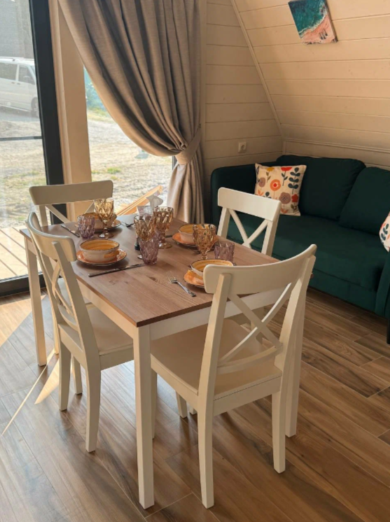 Домики полностью оборудованы всем необходимым для комфортного отдыха. Просторная планировка включает в себя 2 уютные спальни (одна - на мансарде с панорамным видом на горы), светлую кухню-гостиную с панорамными окнами, всю необходимую технику: кондиционеры, Smart TV, интернет Wi-Fi, стиральная и посудомоечная машины, холодильник, микроволновку, чайник, тостер, фен. Кухонная зона оборудована так же всем необходимым для самостоятельного приготовления пищи: посуда, ножи, разделочные доски, сервиз на 6 персон, фужеры, турка для кофе. Домашние мелочи для уюта: банные полотенца, шампунь, гель для душа, мыло. Гостеприимные дополнения: чай, кофе, горячий шоколад для детей. На территории есть парковка.