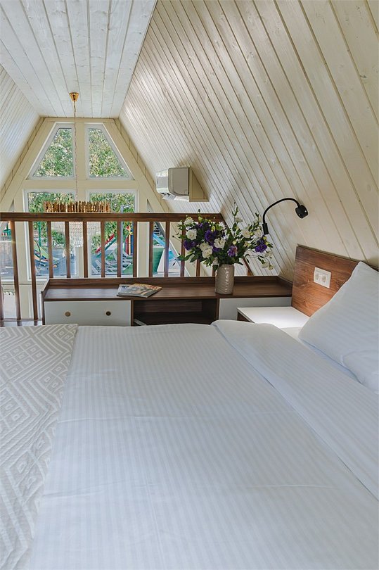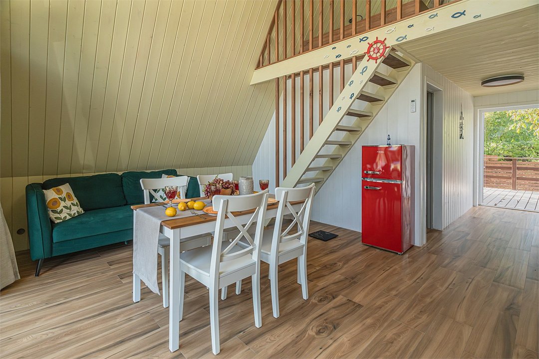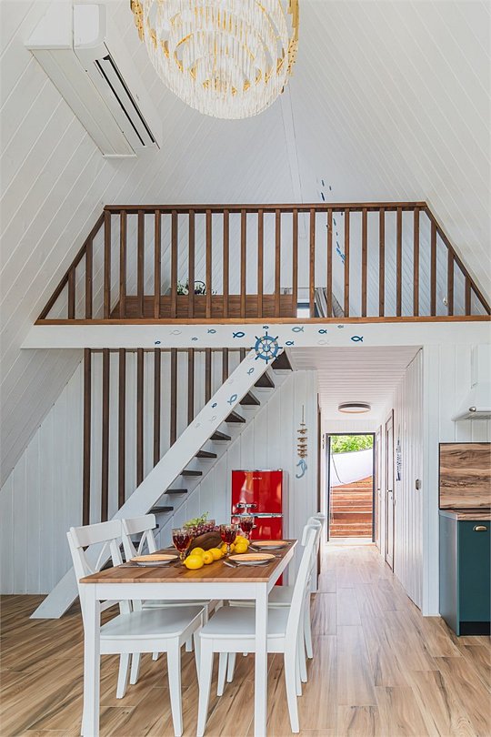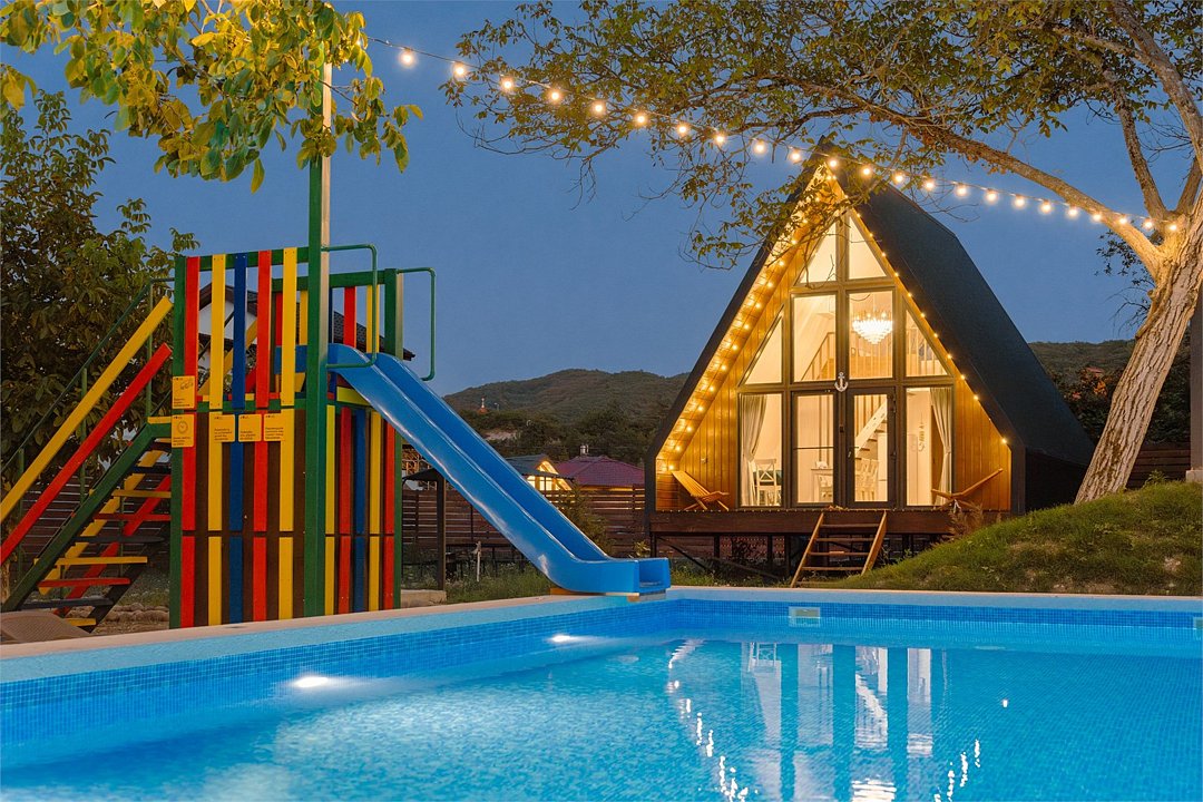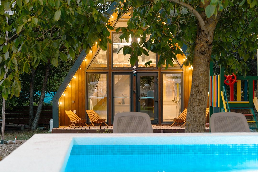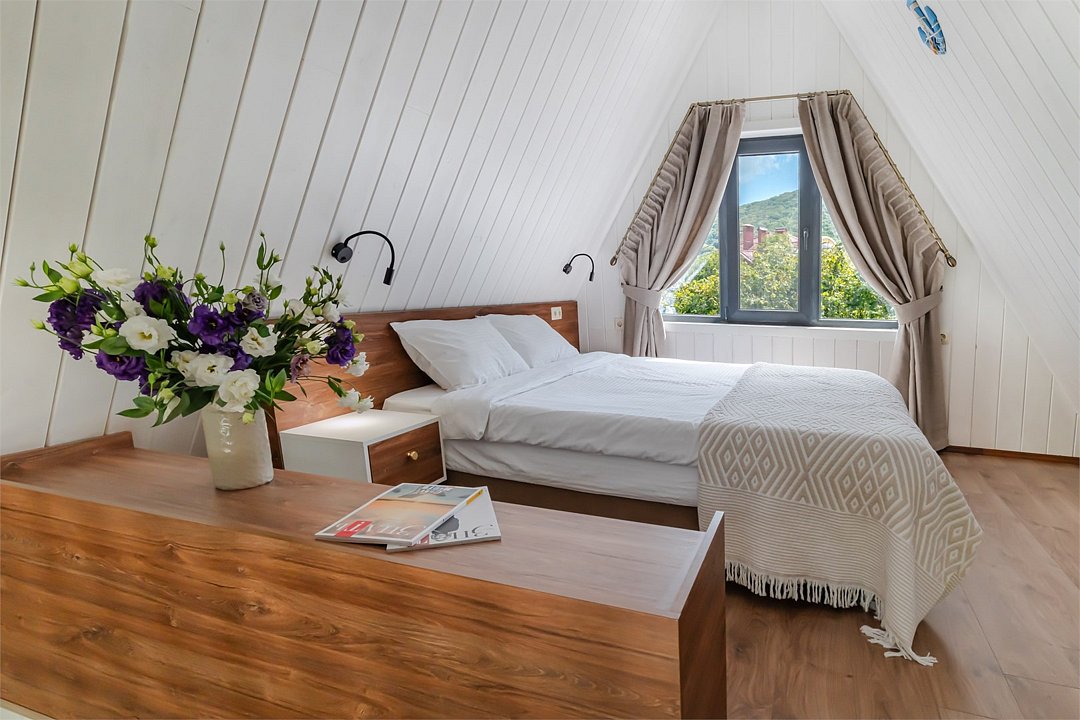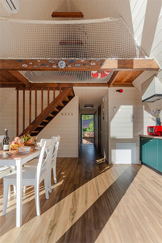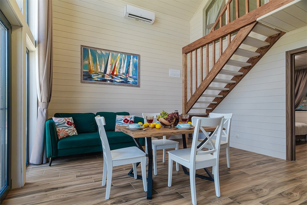 Коттедж "Яхта" — уютный двухэтажный дом, рассчитанный на размещение до 6 гостей. Идеален для семей с детьми или двух пар. В коттедже: терраса 10 м² (2×5 м) спереди, личный задний двор с уличной мебелью, две изолированные комнаты, просторная гостиная с раскладным диваном, кухня, укомплектованная всем необходимым: плита, микроволновка, посудомоечная машина, тостер, электрочайник, посуда, стиральная машина, два кондиционера, совмещённый санузел на первом этаже и отдельный туалет на втором, 4 основных и 2 дополнительных спальных места, парковка на закрытой территории. Коттедж расположен на территории базы отдыха "Теремки", где вас ждут: подогреваемый бассейн, закрытая охраняемая территория, уединённое расположение в горах, чистейший воздух и тишина, всего 10 минут до моря, детская игровая площадка.Услуги и удобства