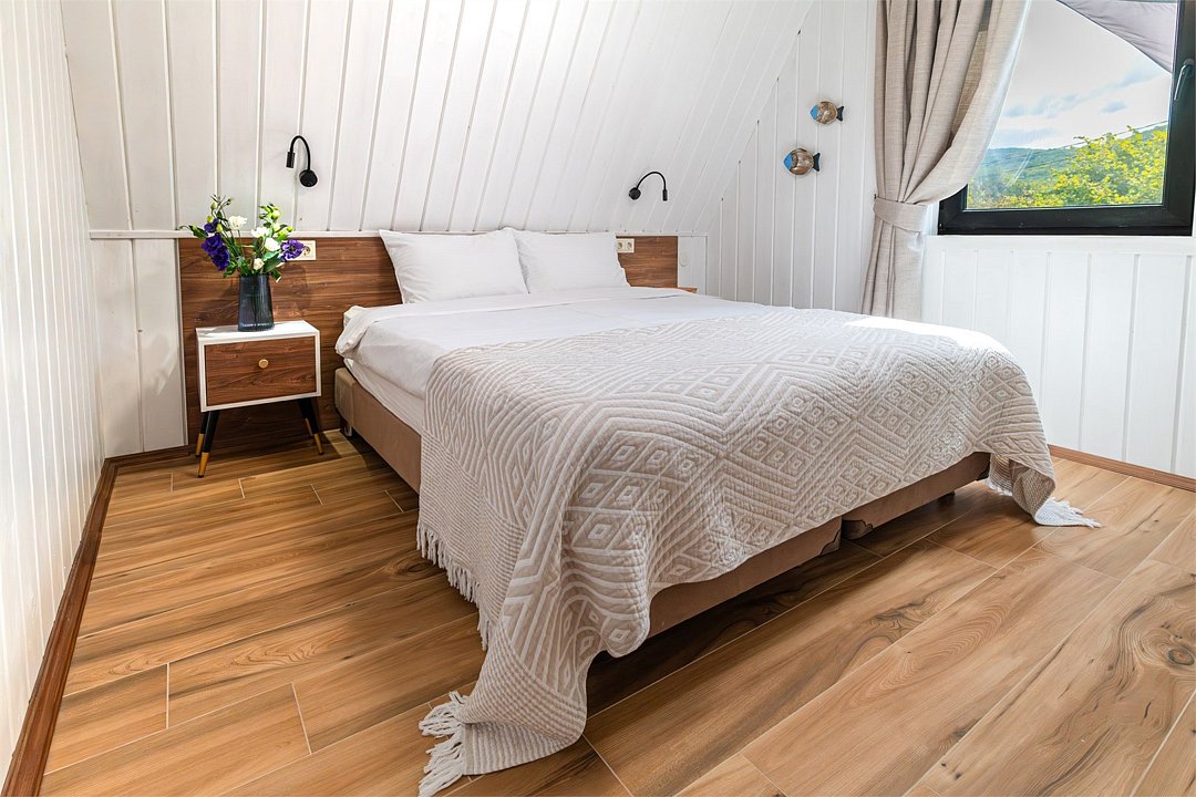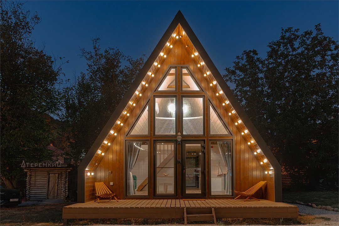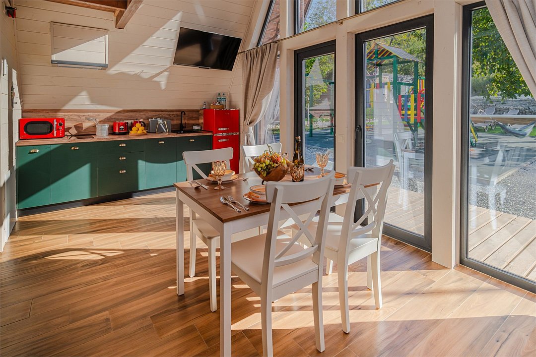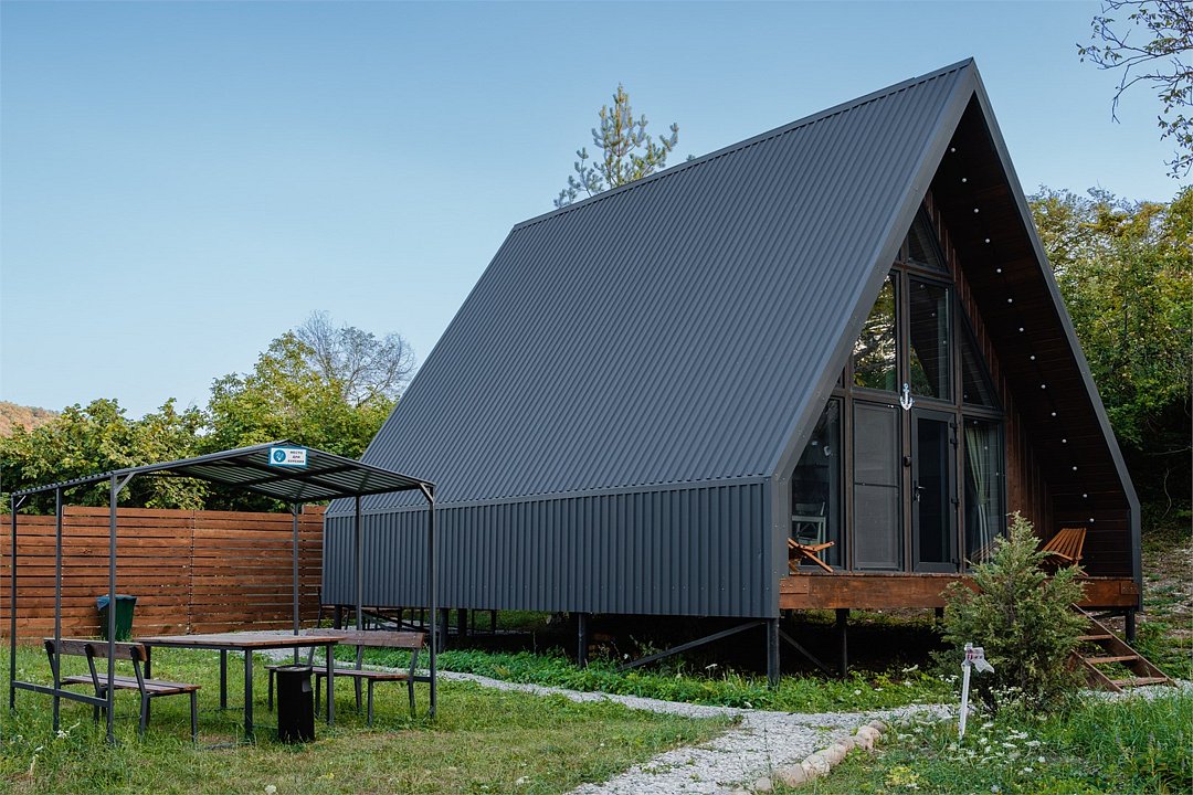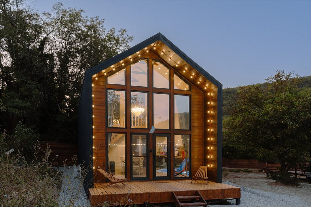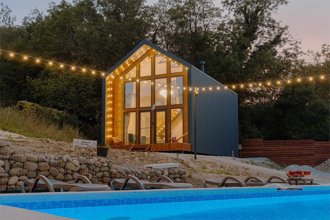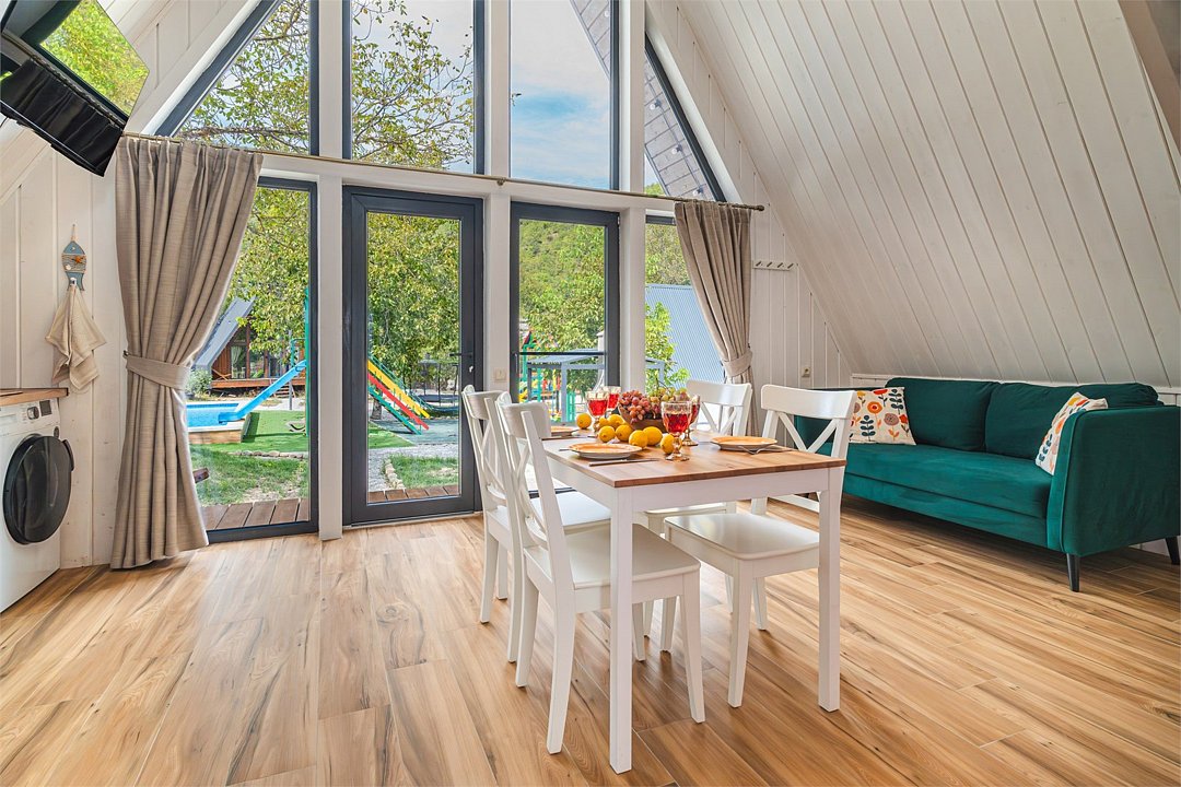 Коттедж "Рыбка" — самый просторный дом на базе отдыха «Теремки», площадью 63 м². Идеально подойдёт для семей с детьми или компаний до 7 человек. В коттедже: терраса 12 м² спереди, большой личный задний двор с уличной мебелью, изолированная спальня на первом этаже, раскладной диван в гостиной, кухня, укомплектованная всем необходимым: плита, микроволновка, посудомоечная машина, тостер, чайник, посуда, стиральная машина, два кондиционера, раздельный санузел, 4 основных спальных места + 2 доп. места + гамак (дополнительное место), парковка на закрытой территории. Коттедж расположен на территории базы отдыха "Теремки", где вас ждут: подогреваемый бассейн, закрытая охраняемая территория, уединённое расположение в горах, чистейший воздух и тишина, всего 10 минут до моря, детская игровая площадка.Услуги и удобства
