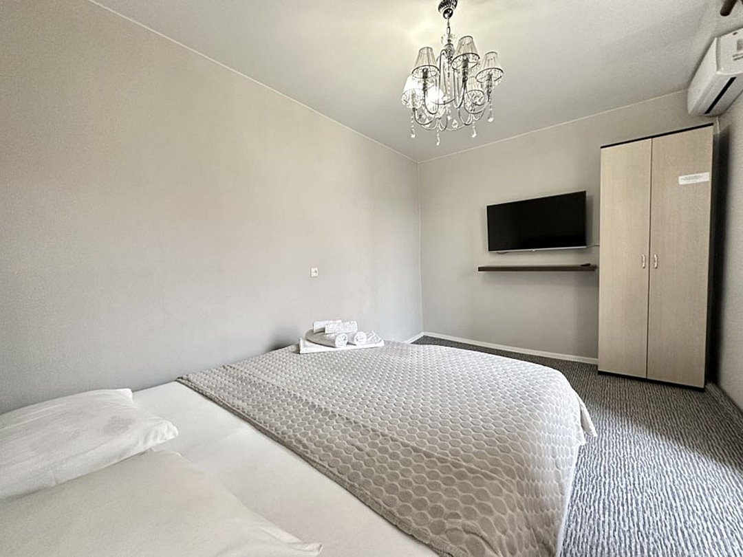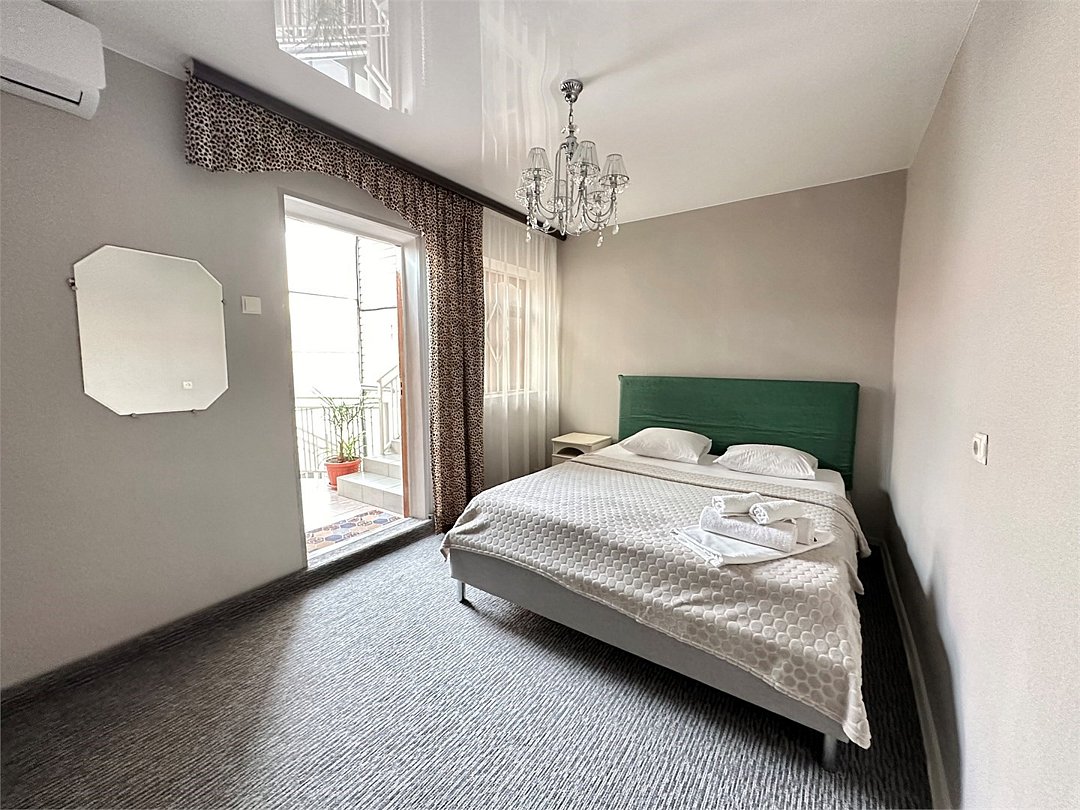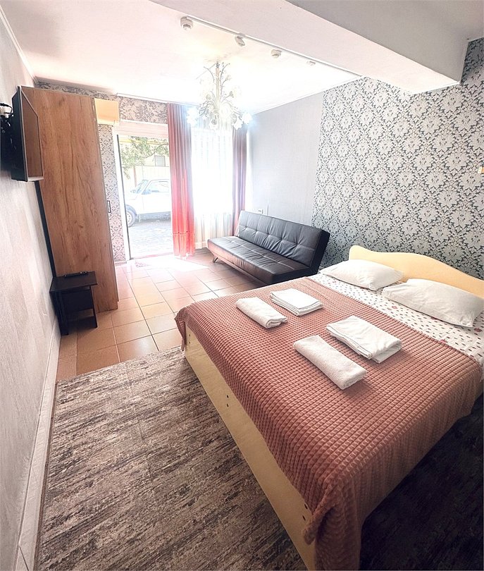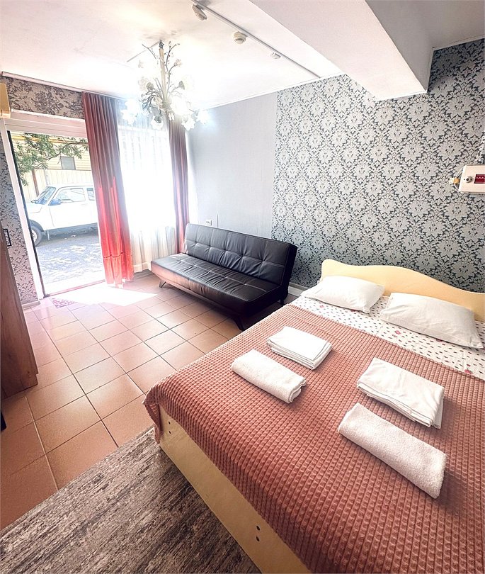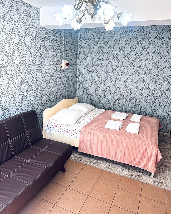 Четырехместный номер с отдельным входом, двуспальной кроватью и диваном, мебелью, телевизором, холодильником, кондиционером и собственным санузломУслуги и удобства