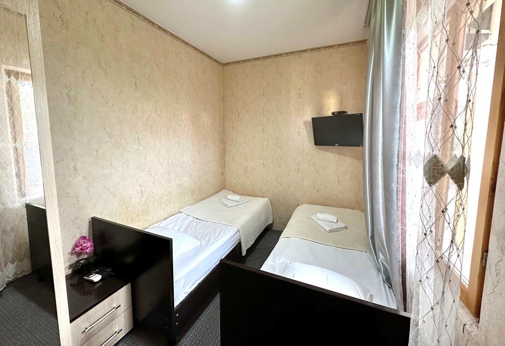 Двухместный номер с двуспальной или двумя односпальными кроватями, мебелью, техникой и собственным санузломУслуги и удобства