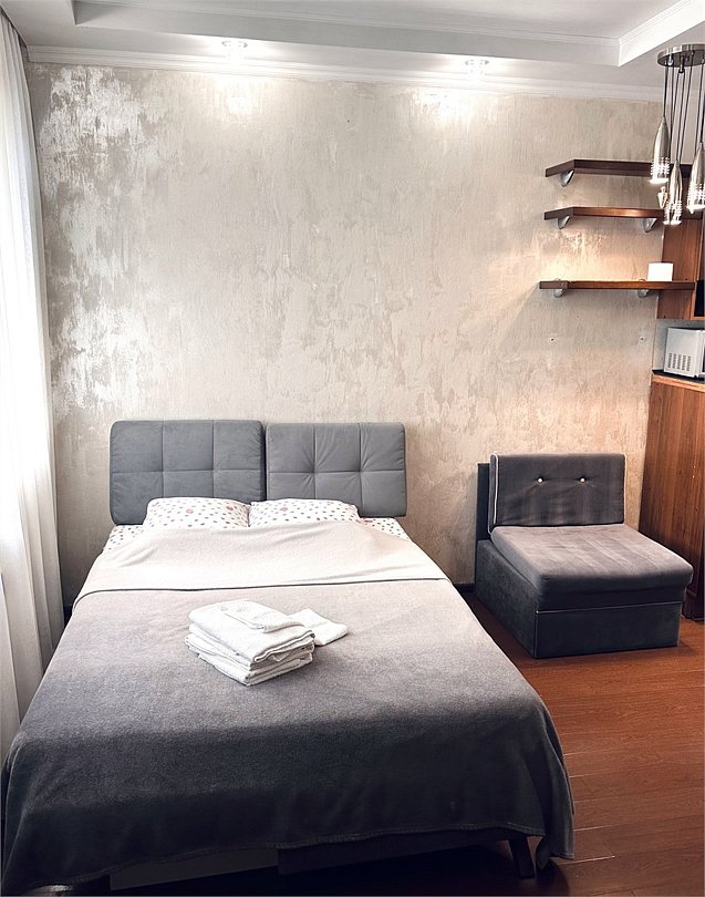Wi-Fi, кондиционер, фен, утюг, санузел, банные полотенца, двуспальная кровать, шкаф для одежды, унитаз, раковина, душ, вид на город, тумба, мини-холодильник, двуспальный раскладной диван-кровать, мылоВ гостиничном номере