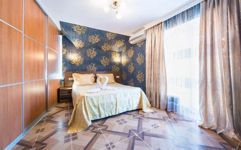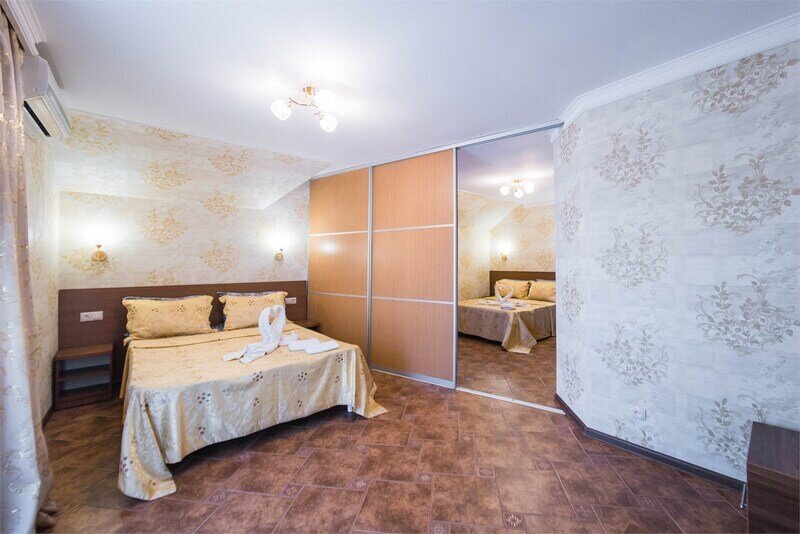 Кровать двуспальная (или 2 раздельные), мебельный гарнитур, тумбочки прикроватные, холодильник, кондиционер, телевизор, санузел (душ+туалет), халат+тапочки