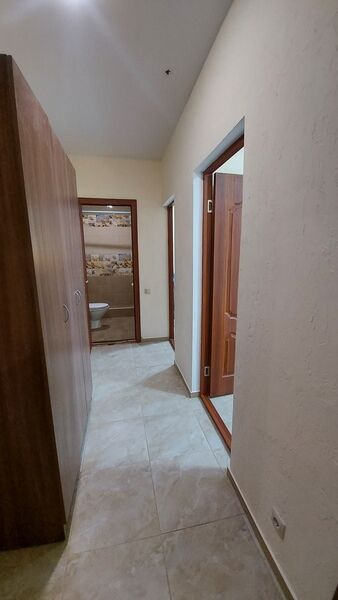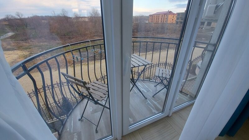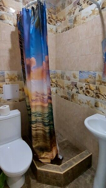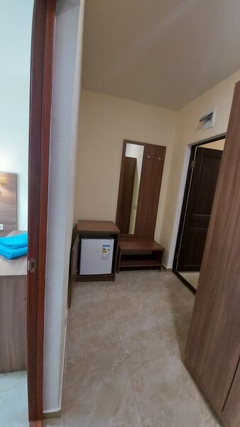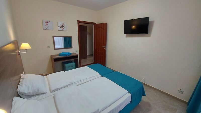 До песчаного побережья 10—15 минут ходьбы, на пляже установлены кабинки для переодевания, есть лежаки и навесы от солнца.