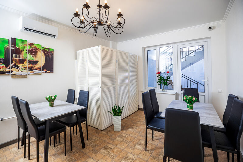В «888» созданы все условия для гостей. Вы можете провести время в небольшой зоне отдыха, оборудованной удобными столиками и стульями. Если проголодаетесь, на первом этаже есть полноценная кухня с плитой, холодильником, столами. Поэтому вы без труда накормите всю семью. Не хотите проводить отпуск на кухне? Рядом с гостевым домом работают разнообразные кафе и рестораны — японской, итальянской, международной кухни. Также в гостевом доме позаботились о наличии стиральной и сушильной машины. Мы стремимся, чтобы наши гости чувствовали себя как дома и на будущий год вновь выбрали «888».