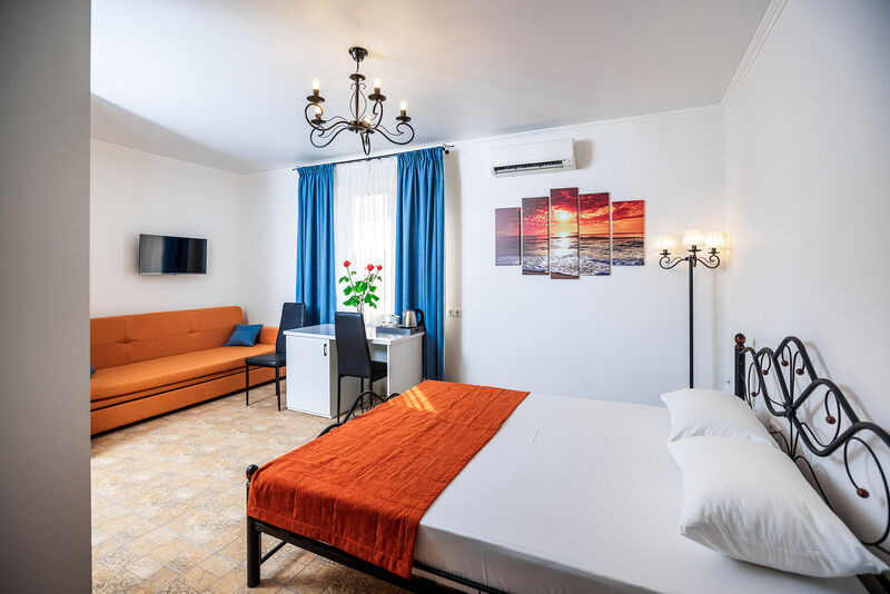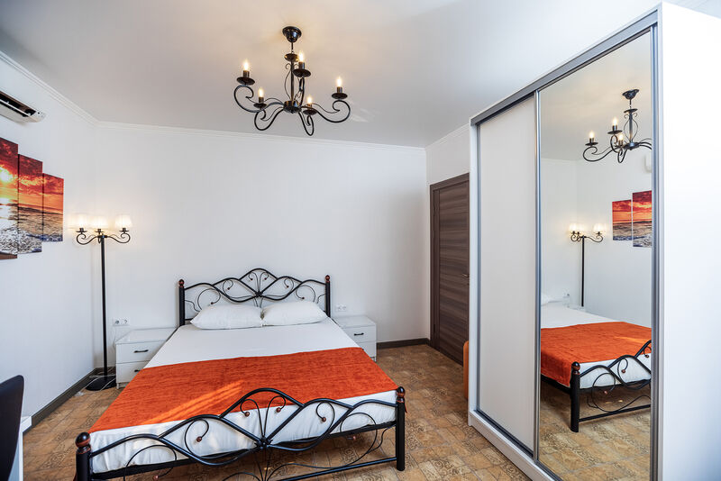Кровать двуспальная диван-кровать, тумбочки прикроватные, шкаф, холодильник, кондиционер, телевизор, чайник, санузел (душ+туалет), туалетные принадлежности