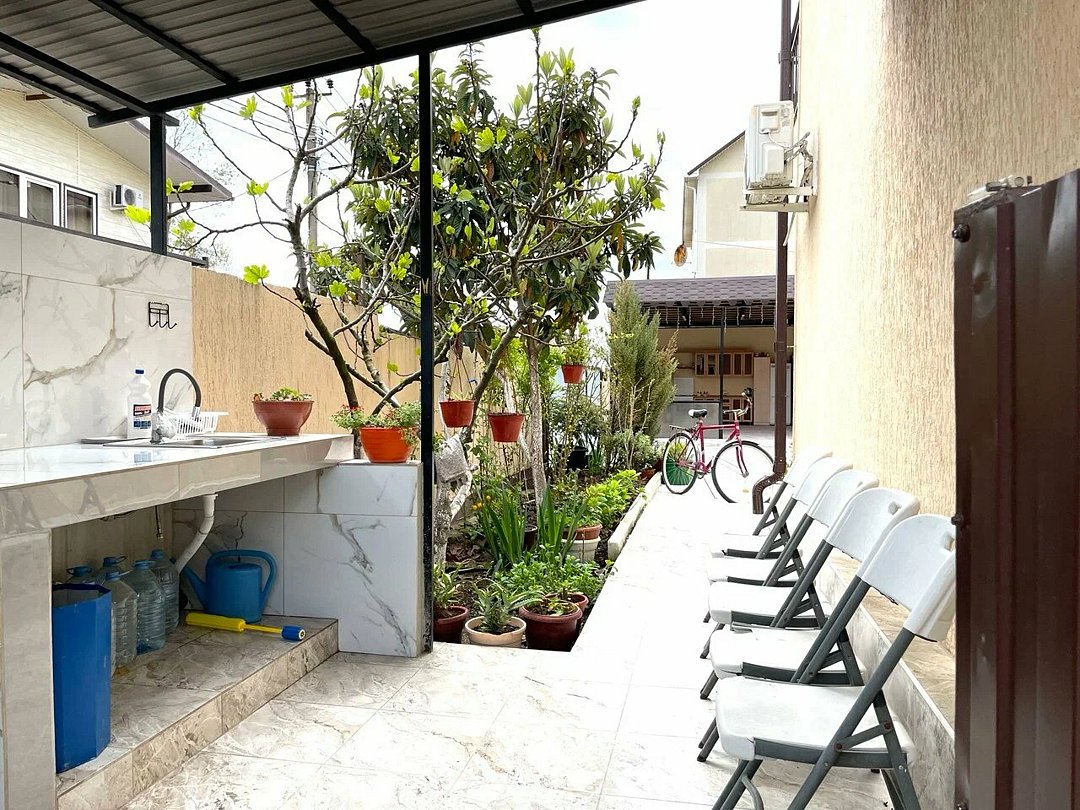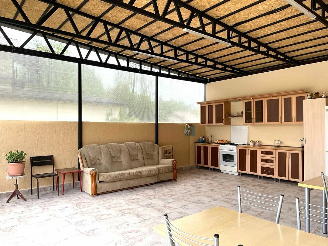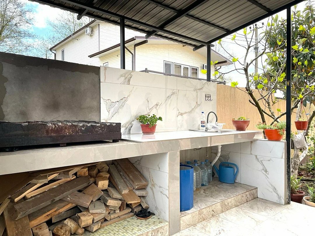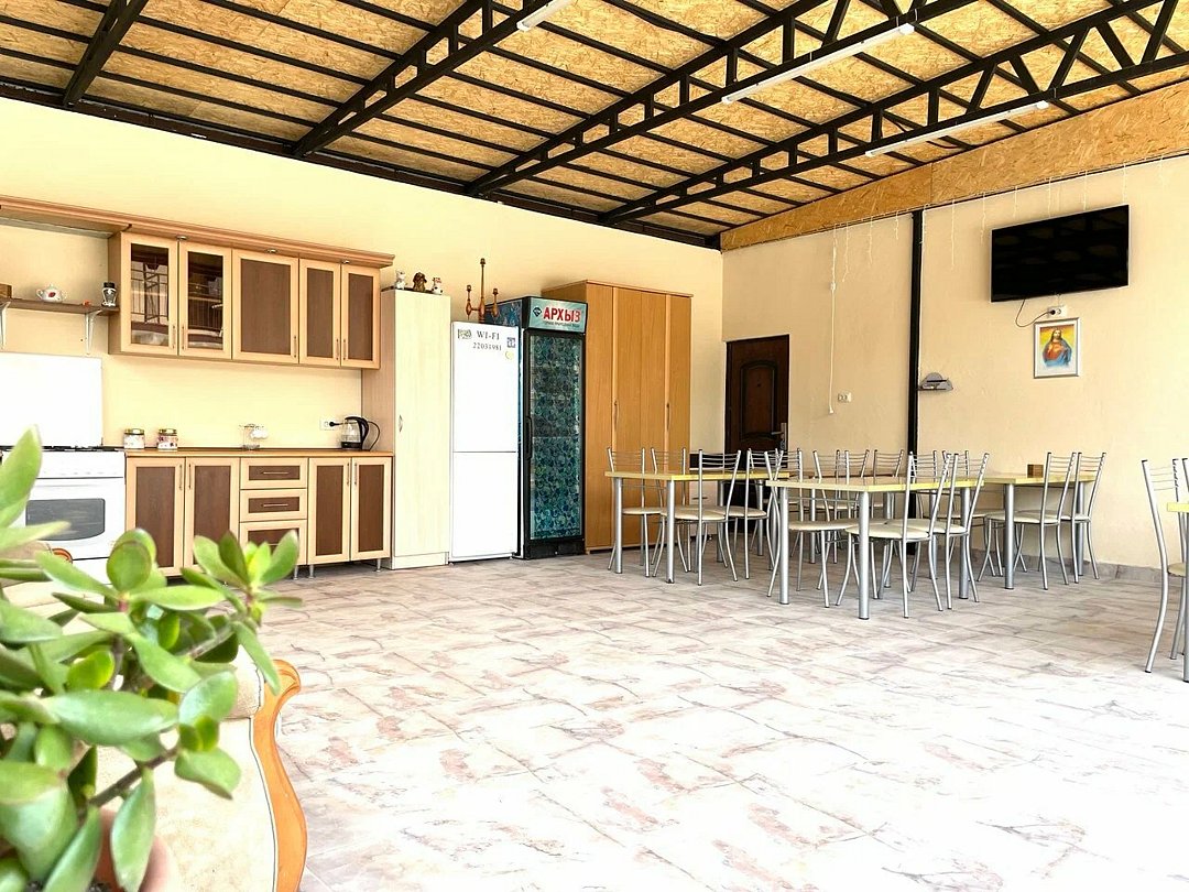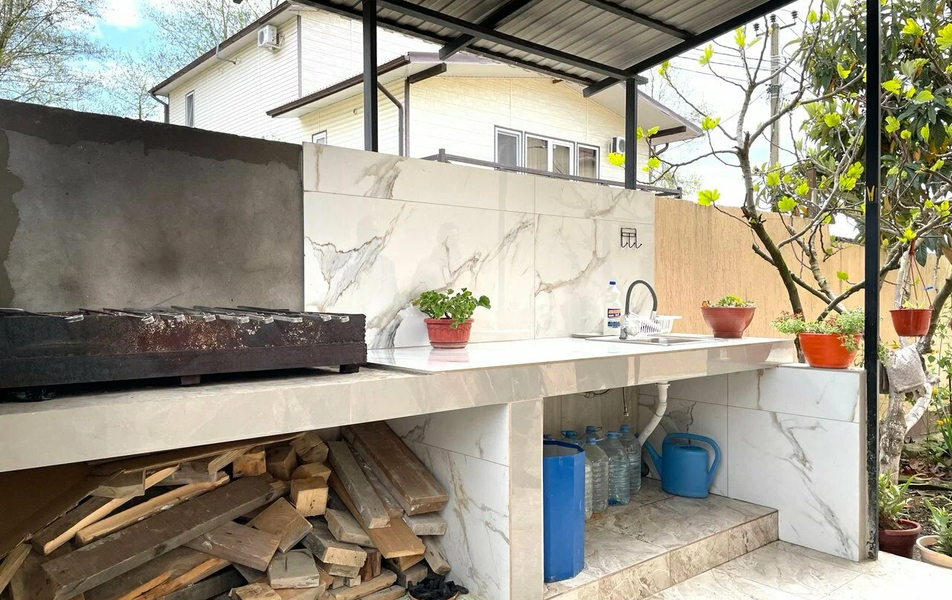 На общей кухне постояльцы найдут все необходимые столовые приборы и посуду, а также смогут воспользоваться мангалом для готовки.
