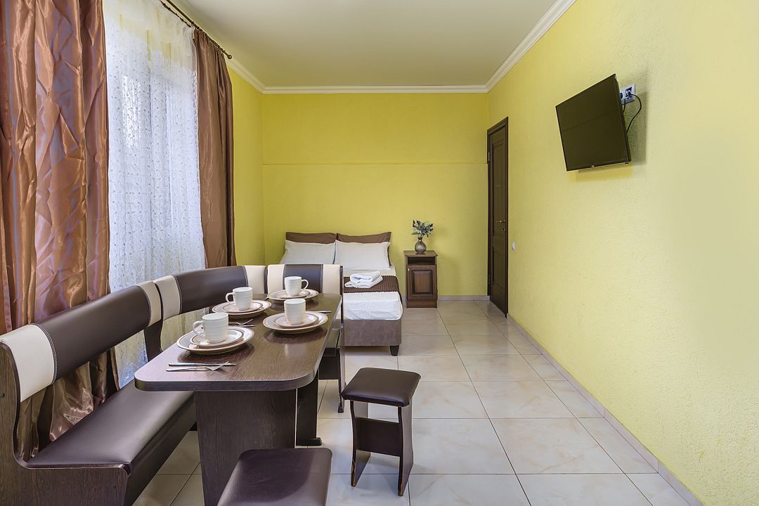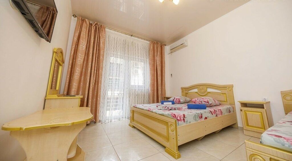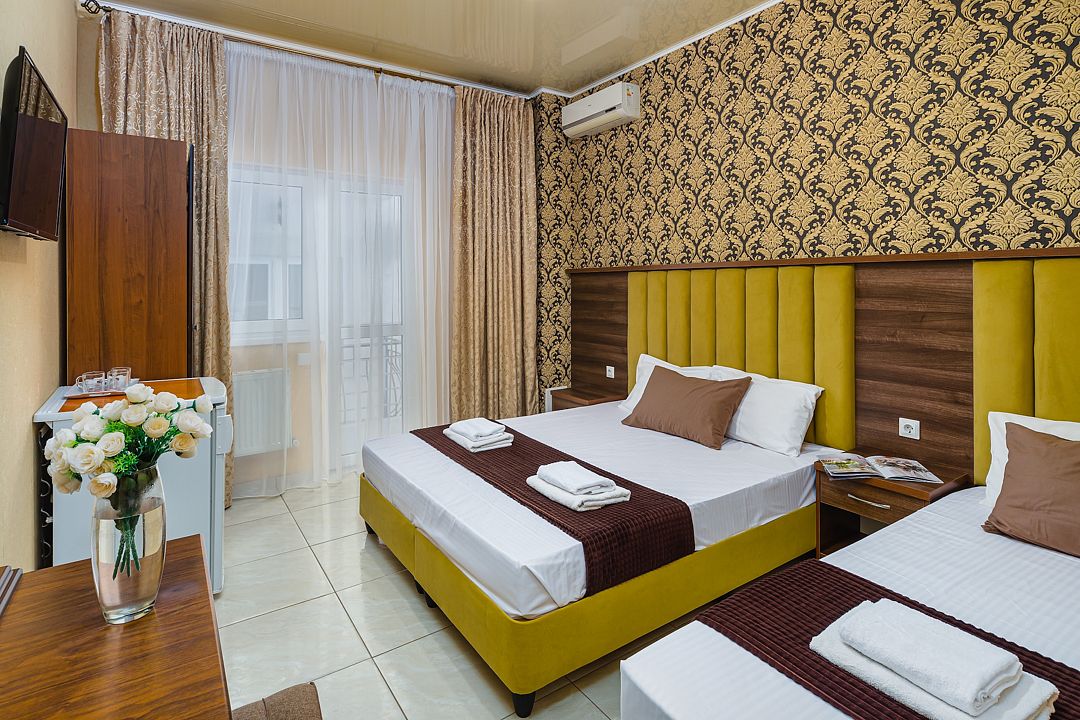 Кровать 2-спальная, кровать 1-спальная, диванчик 1-спальный, тумбочки прикроватные, шкаф, холодильник, кондиционер, телевизор, санузел (душ + туалет), гигиенические принадлежности