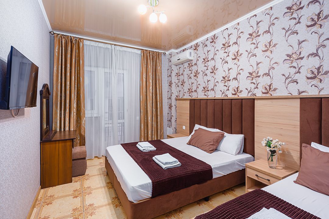 Кровать 2-спальная, кровать 1-спальная, тумбочки прикроватные, шкаф, холодильник, кондиционер, телевизор, санузел (душ + туалет), гигиенические принадлежности