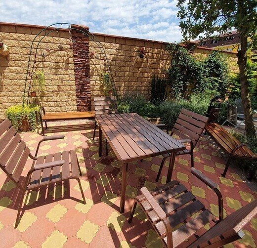 На территории гостевого дома есть детская площадка, игрушки и батут, вся территория под видео наблюдением, дети могут быть на площадке, а родители — находиться рядом в зоне отдыха.