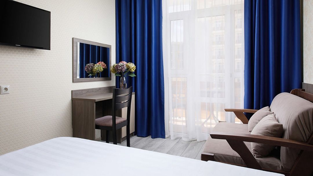 Комфортный однокомнатный номер с одной двуспальной кроватью, раскладным диваном и балконом.