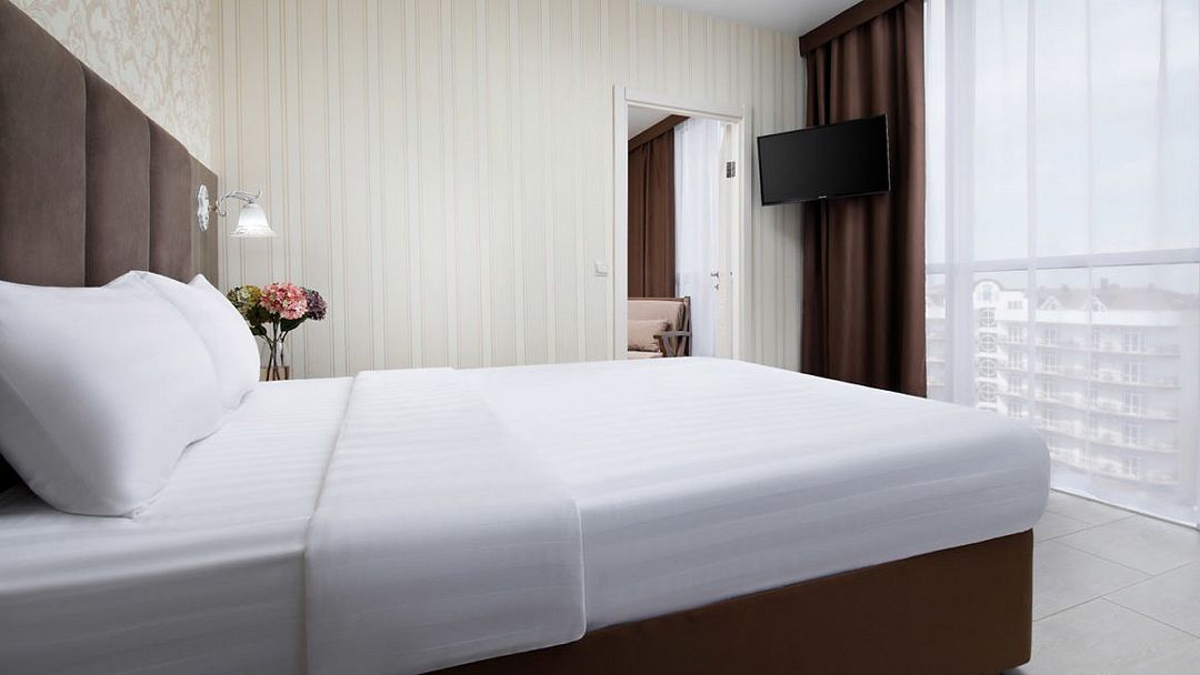 Просторный двухкомнатный номер с большой двуспальной кроватью, двухместным раскладным диваном и балконом.