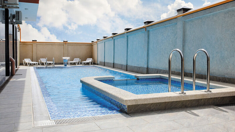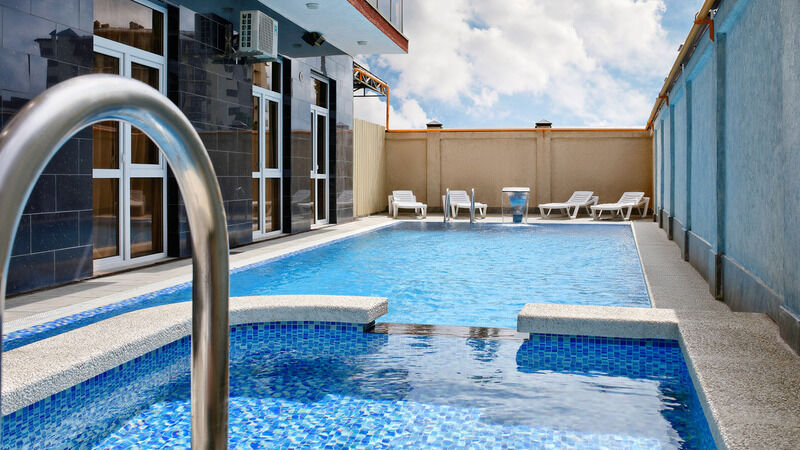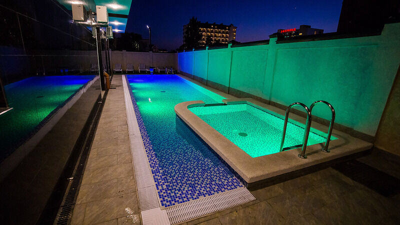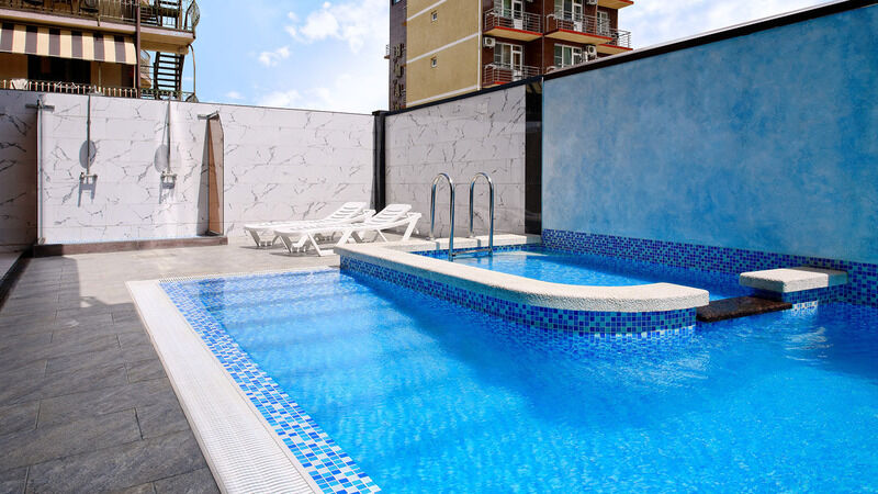 На территории пансионата размещены два открытых бассейна, каждый из которых обладает отдельной детской зоной. Бассейны оборудованы гидромассажем и гейзерами. В вечернее время работает красочная подсветка бассейнов.