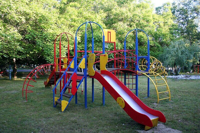 Детский городок оборудован современным игровым детским комплексом: качели, горки, спортивные снаряды.