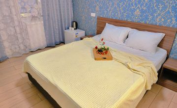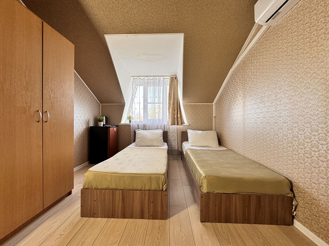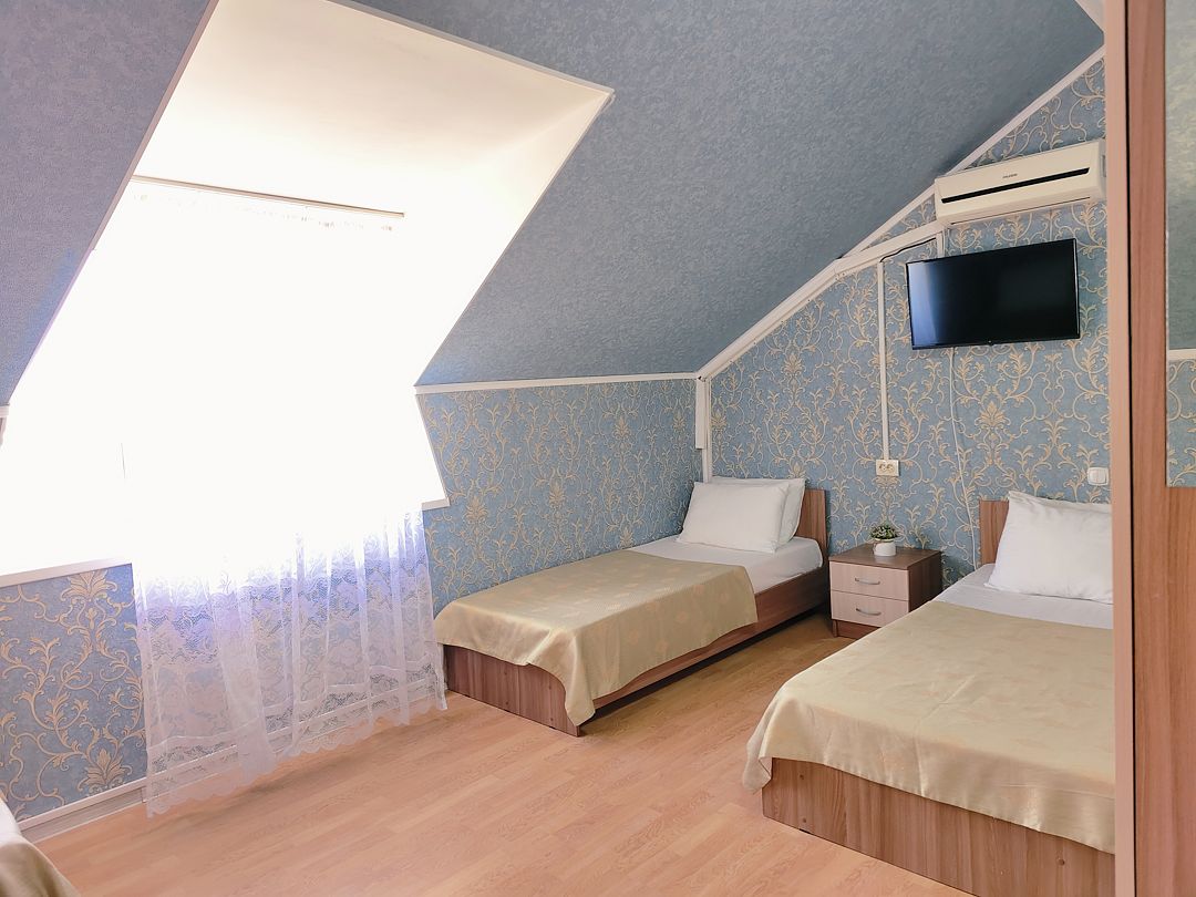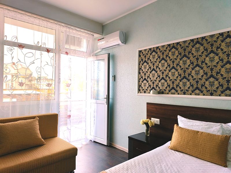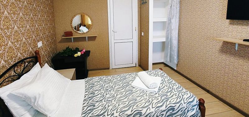 В номере: Двуспальная кровать и двуспальный диван, прикроватные тумбочки,журнальный столик, шкаф,вешалки,зеркало, телевизор, кондиционер, мини-холодильник, электрочайник, набор посуды. Ванная комната: душ, раковина, зеркало, туалет, сушилка для одежды.