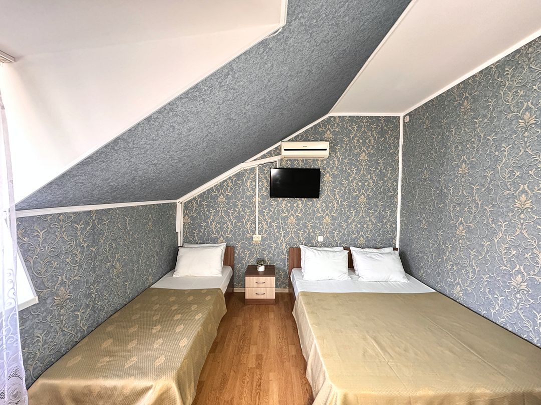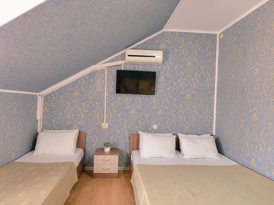 В номере: Двуспальная кровать, односпальная кровать, прикроватные тумбочки,журнальный столик, шкаф,вешалки,зеркало, телевизор, кондиционер, мини-холодильник, электрочайник, набор посуды. Ванная комната: душ, раковина, зеркало, фен, туалет, сушилка для одежды.