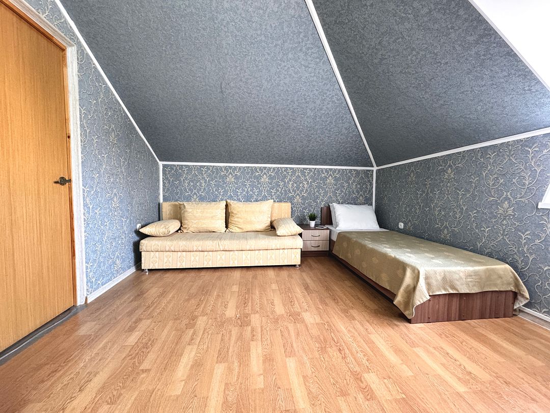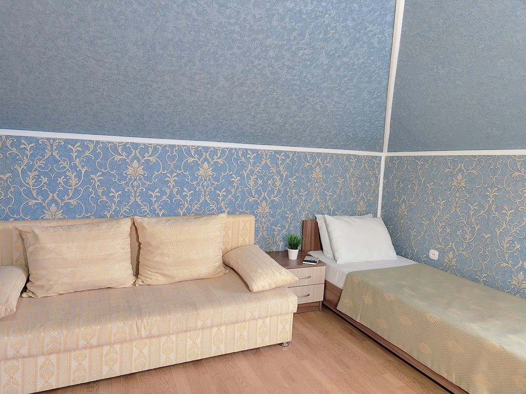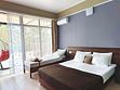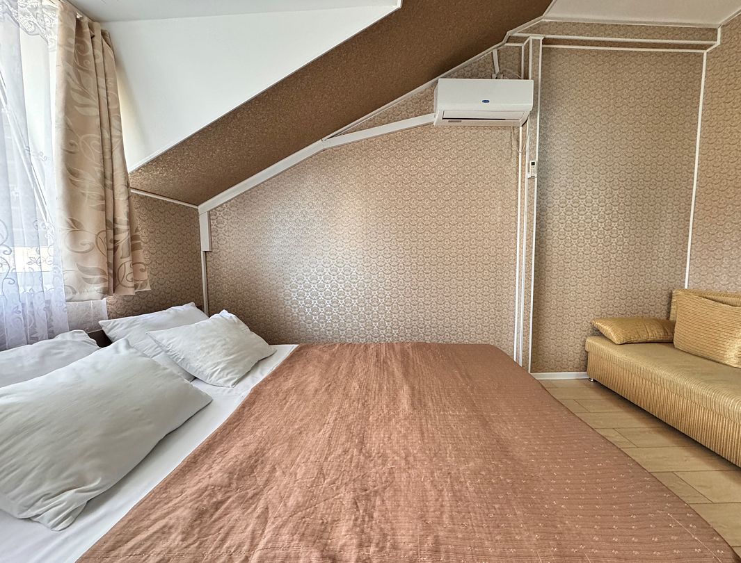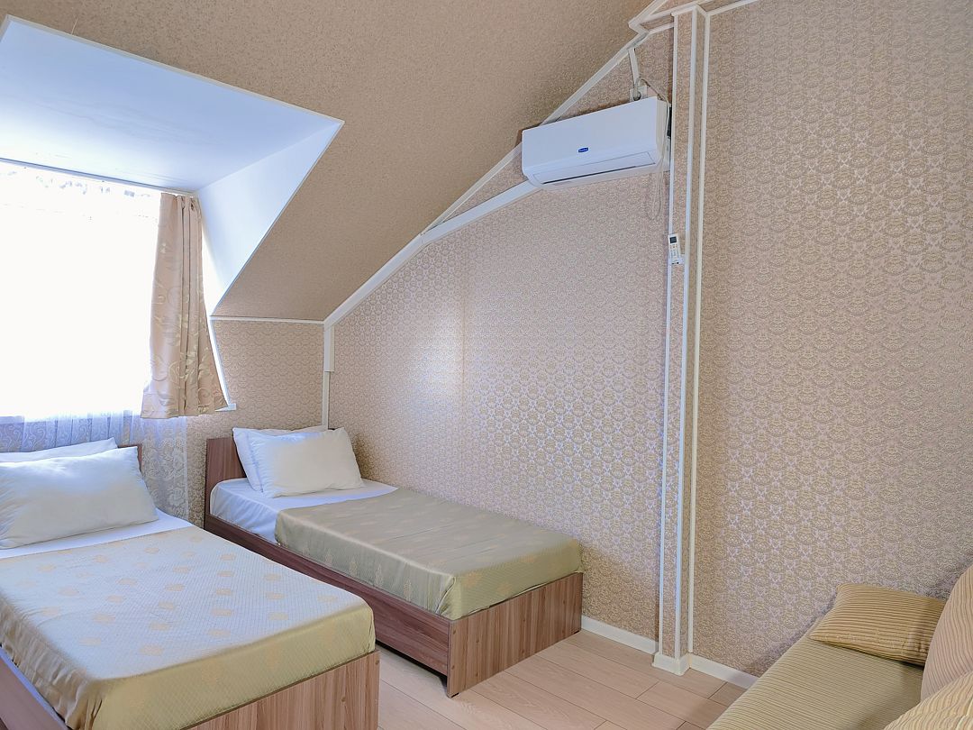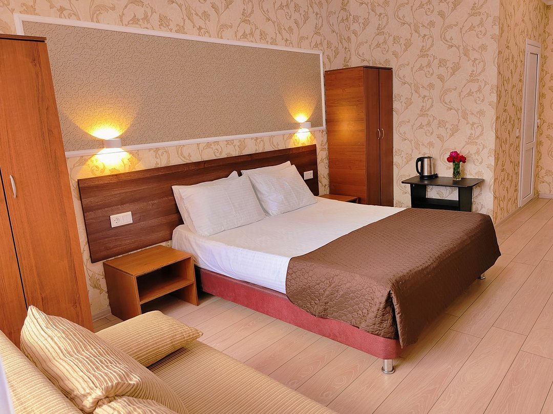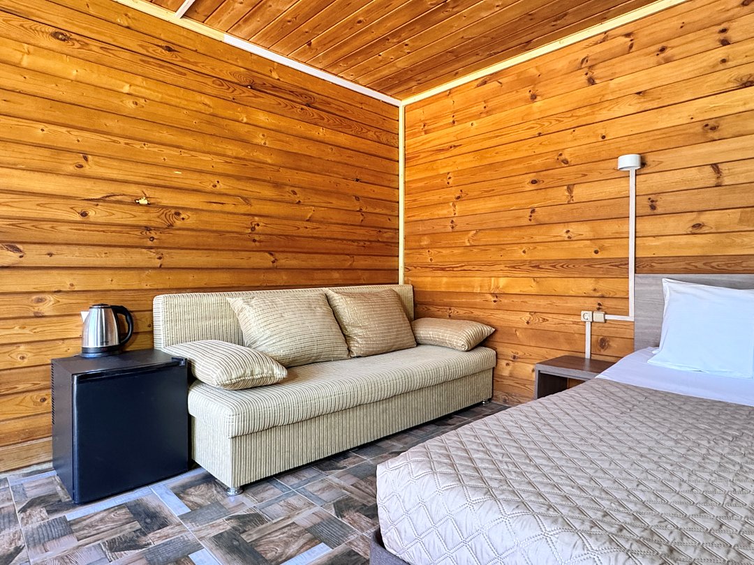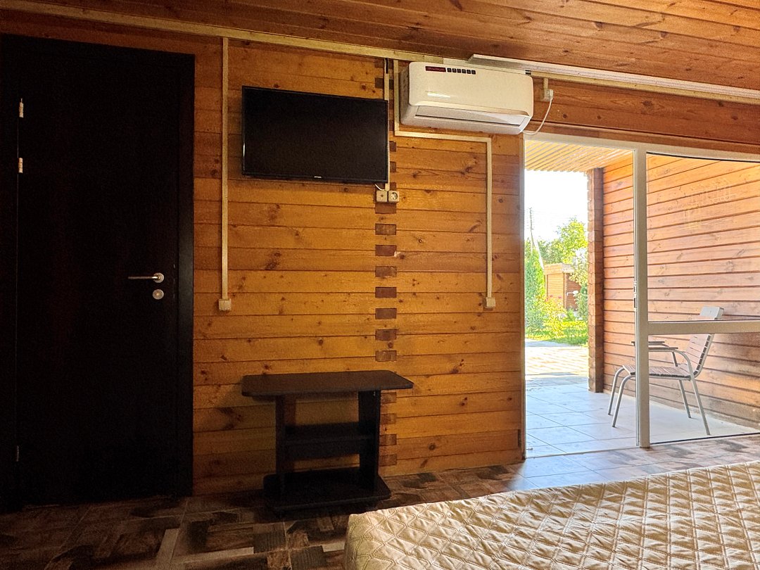 В номере: двуспальная кровать, односпальный диван, прикроватные тумбочки,журнальный столик, шкаф,вешалки,зеркало, телевизор, кондиционер, мини-холодильник, электрочайник, набор посуды. Ванная комната: душ, раковина, зеркало, туалет, сушилка для одежды. Индивидуальная зона отдыха с отдельным входом в номер.
